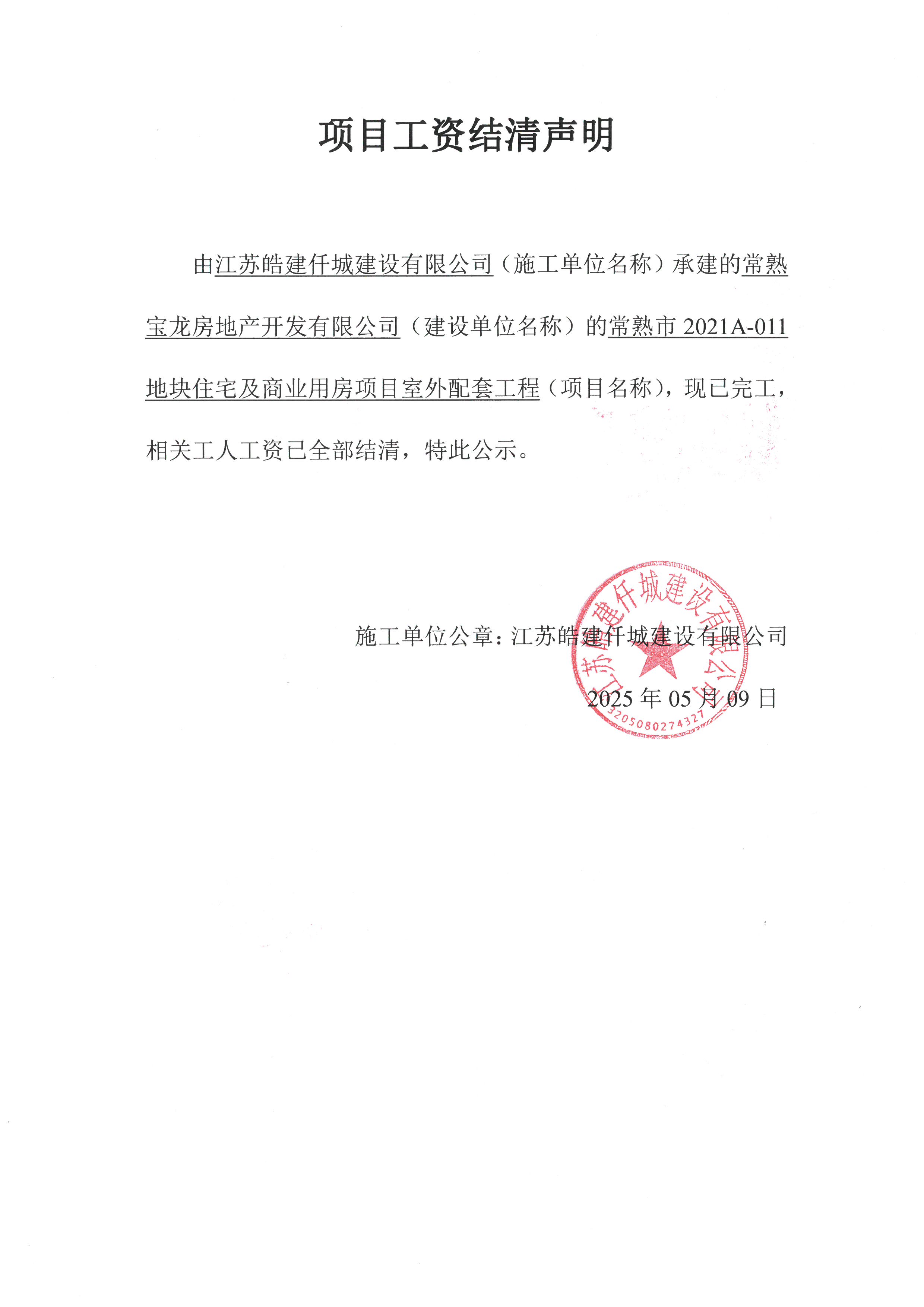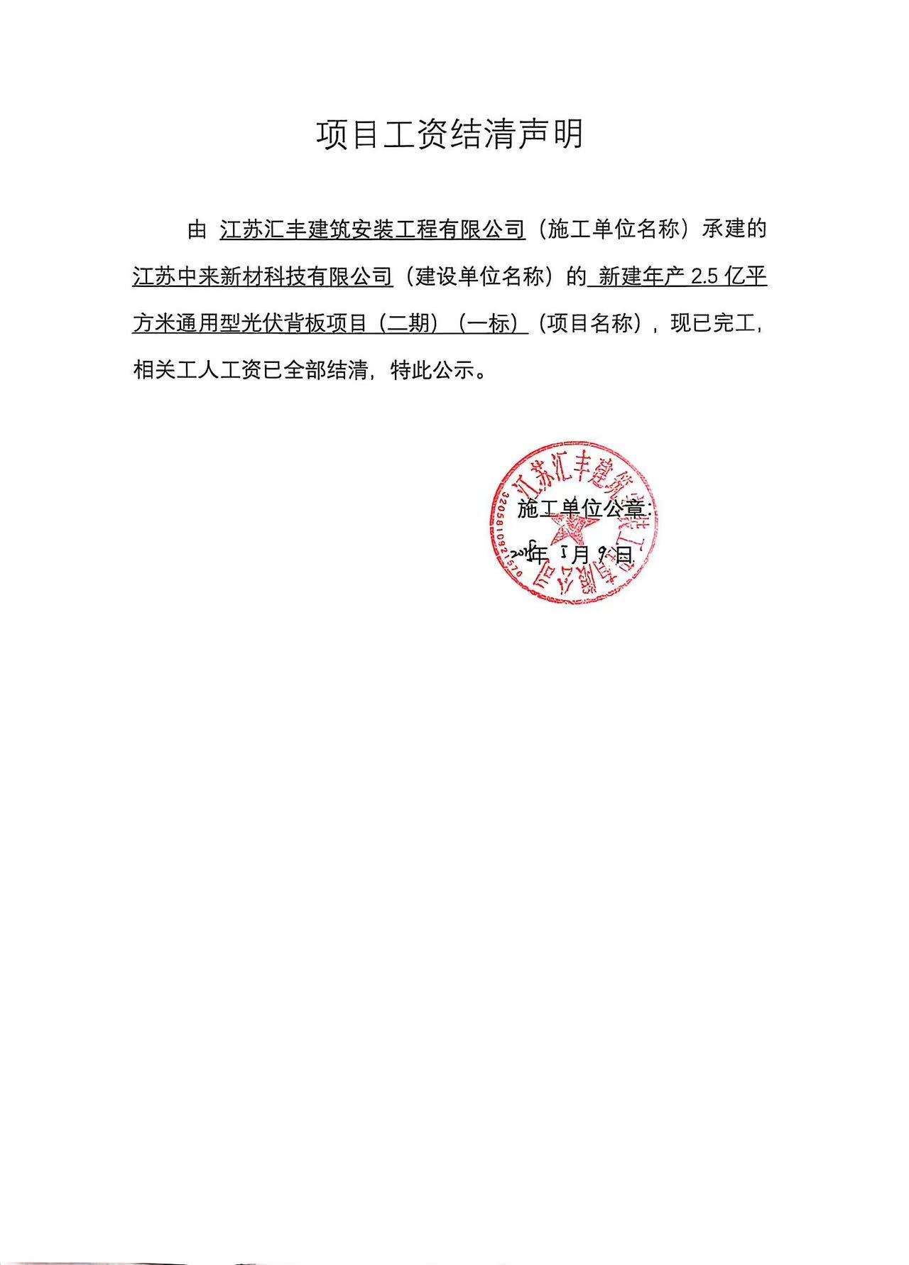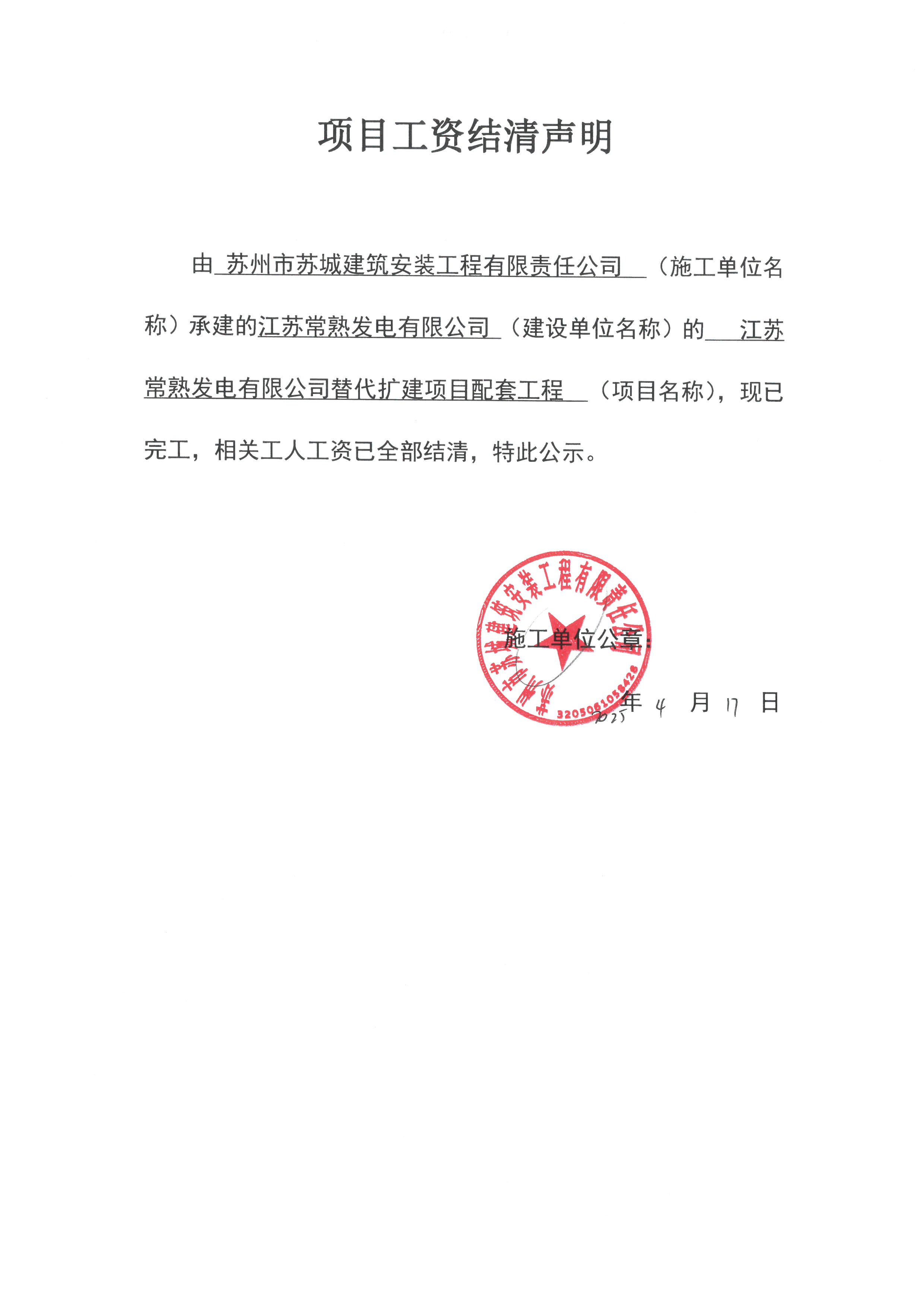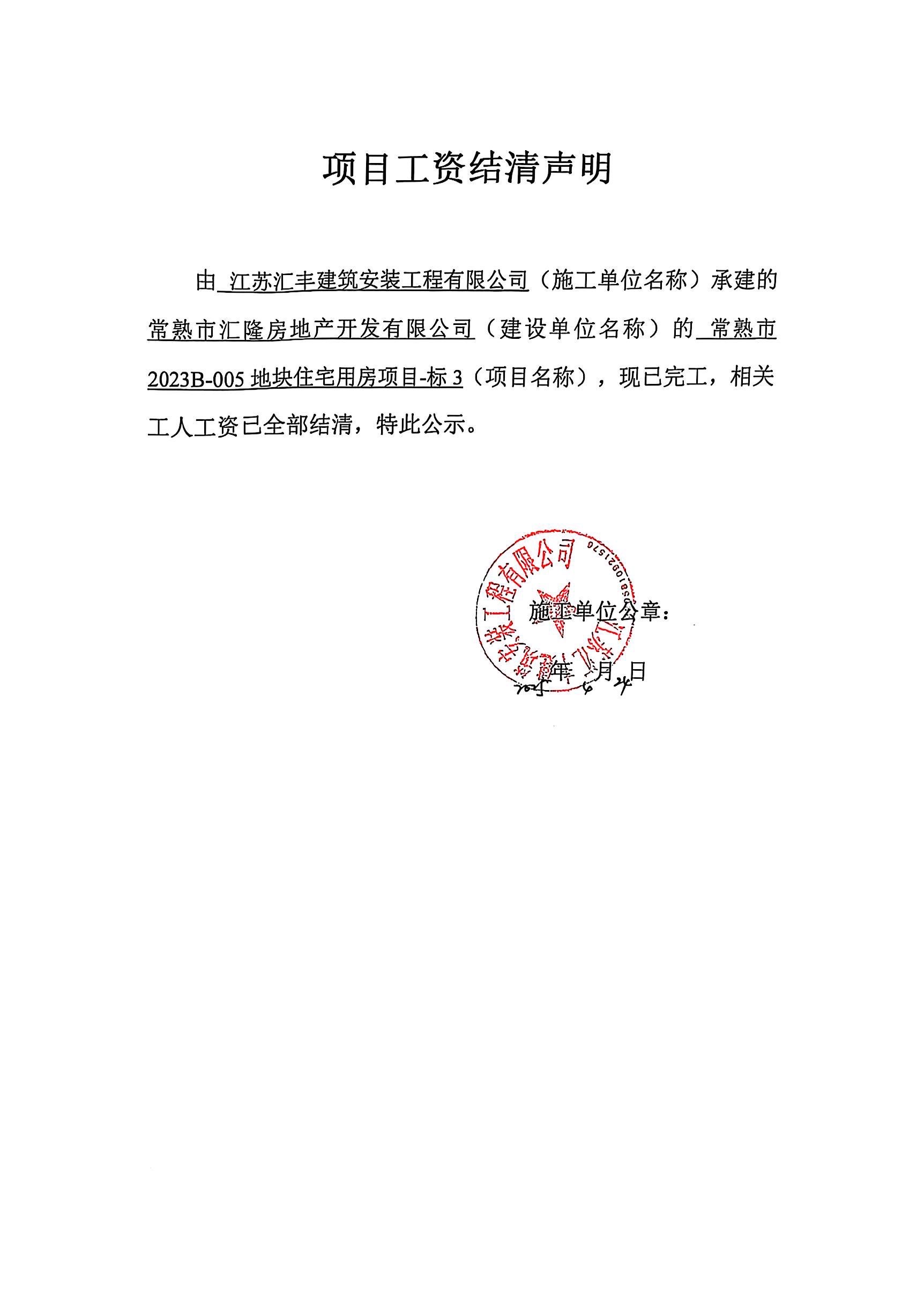 项目工资结清支付公示