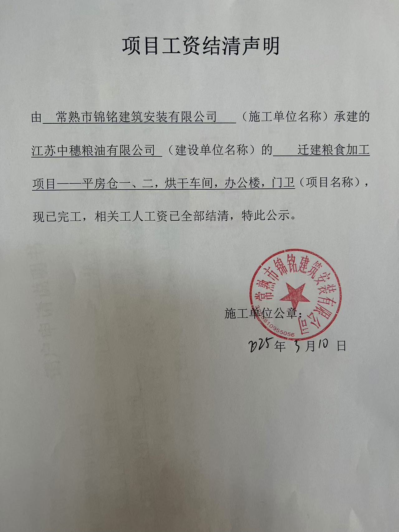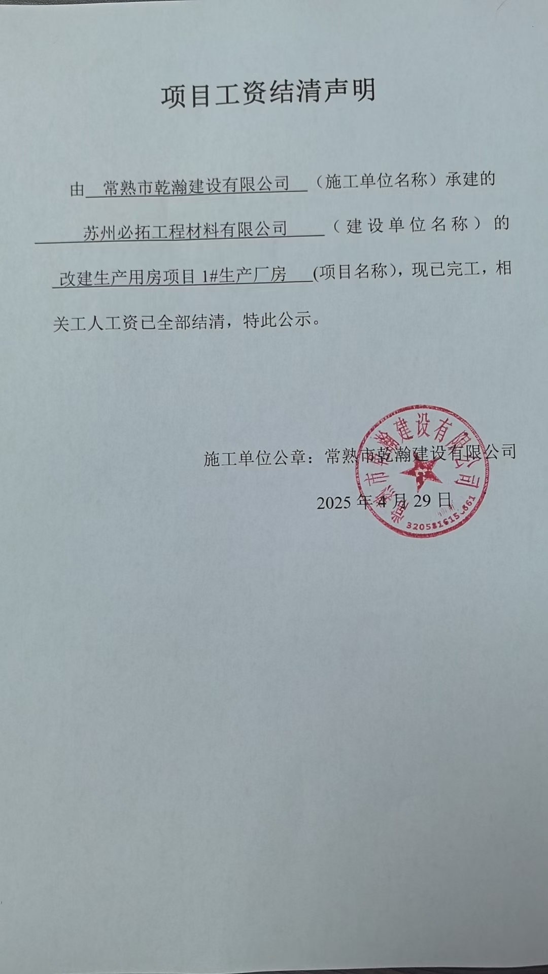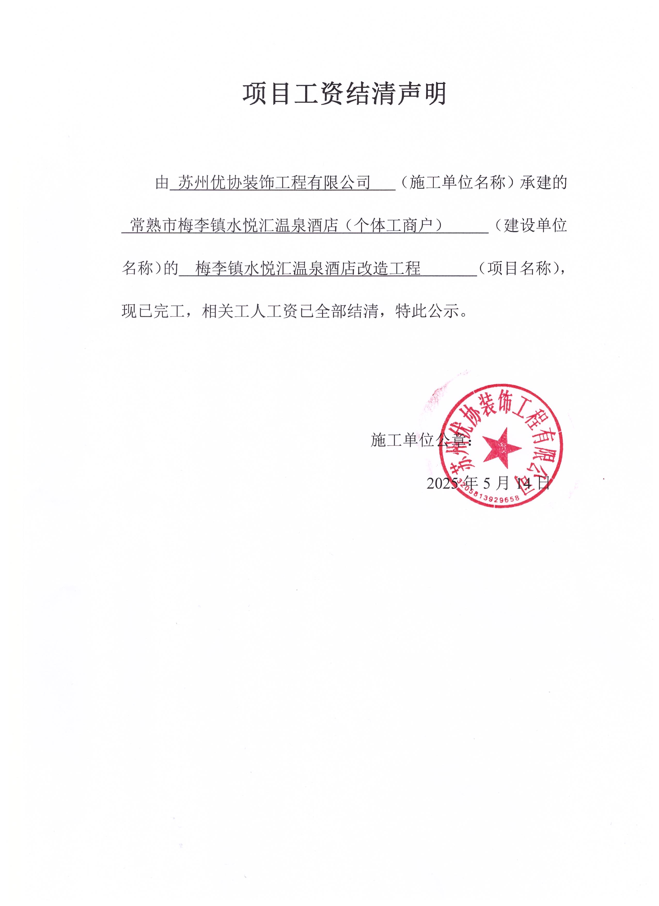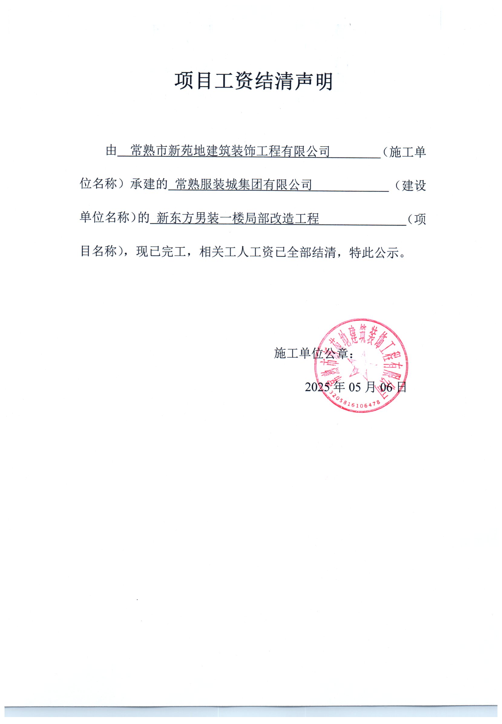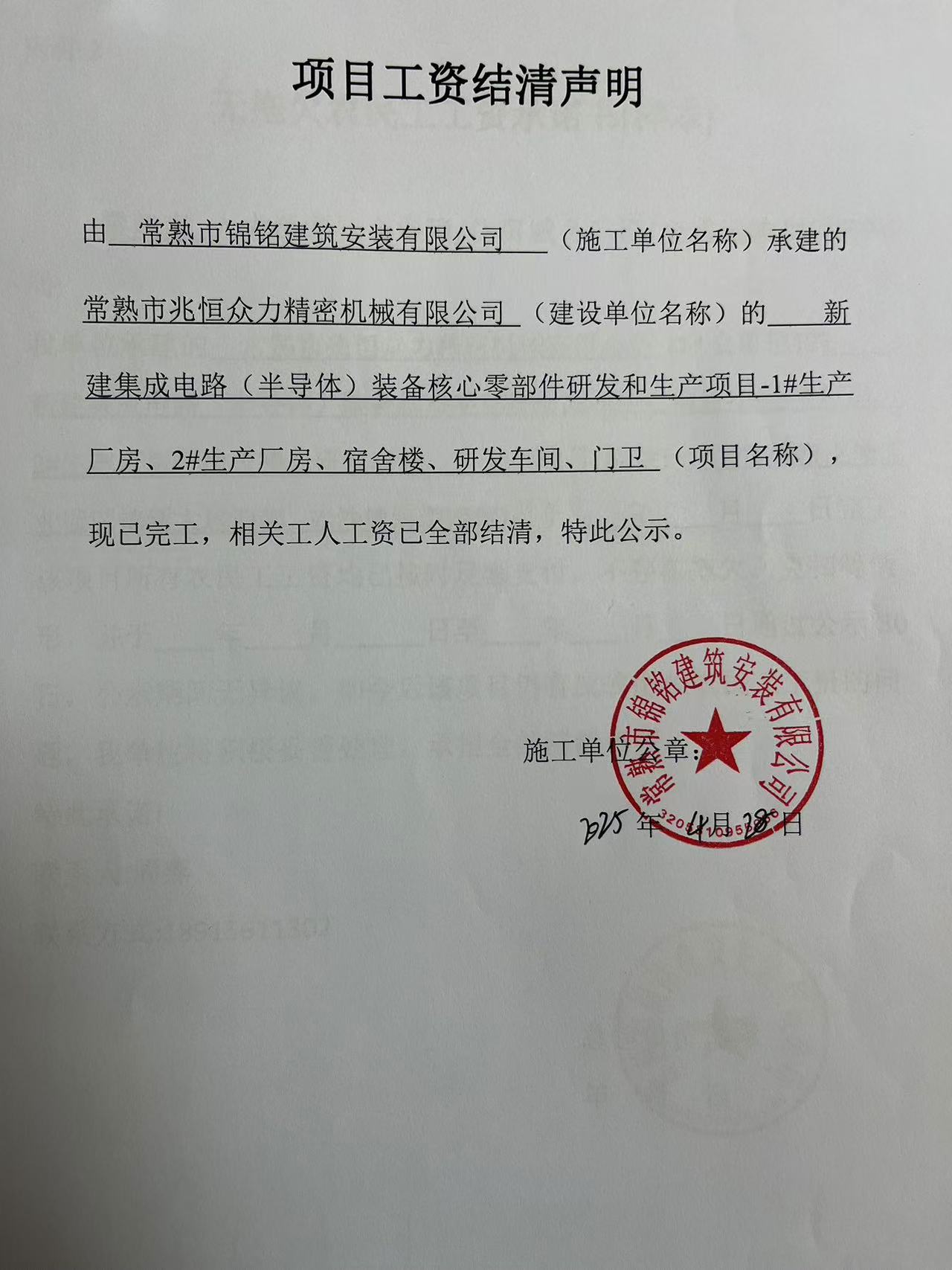 项目工资结清支付公示