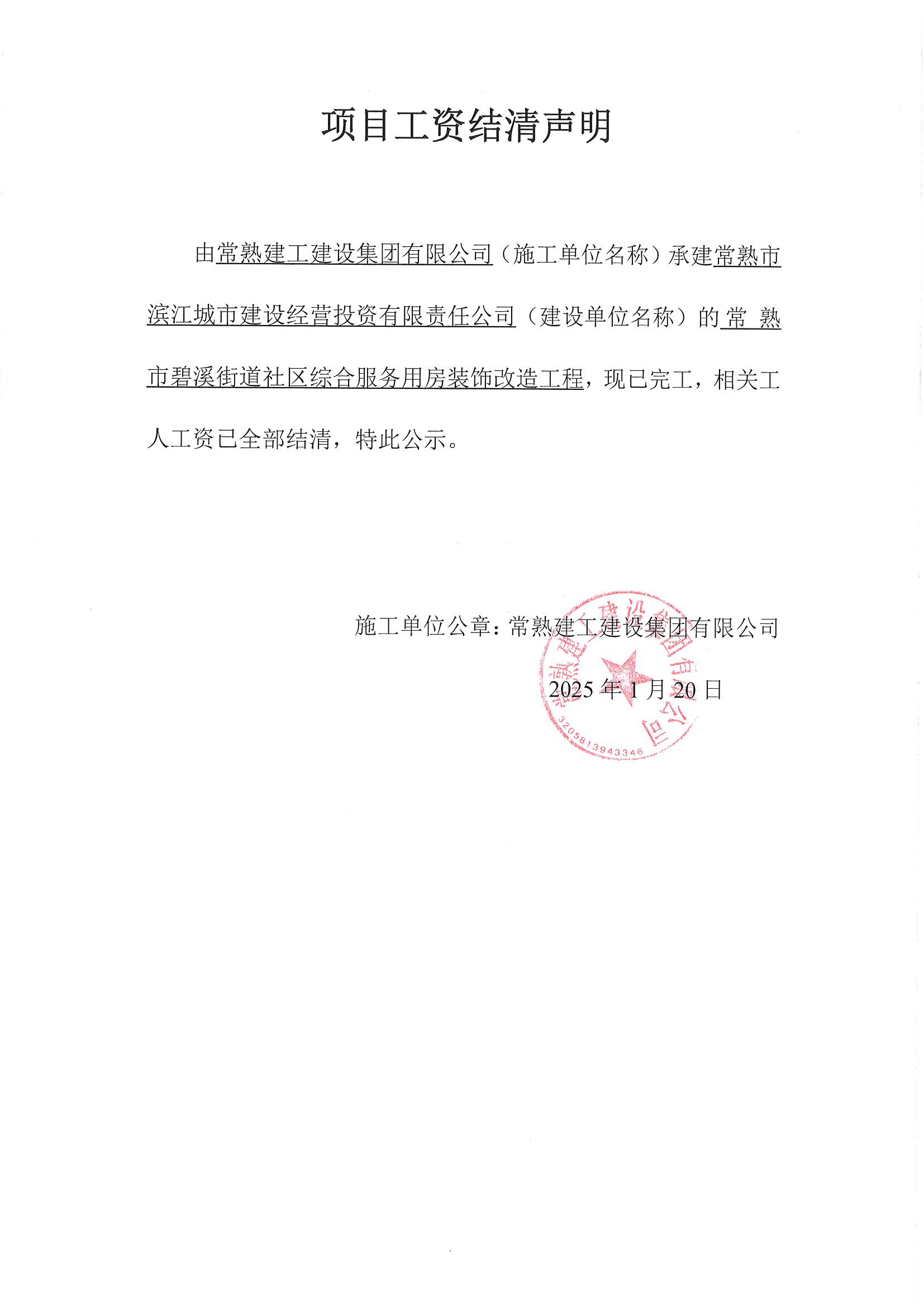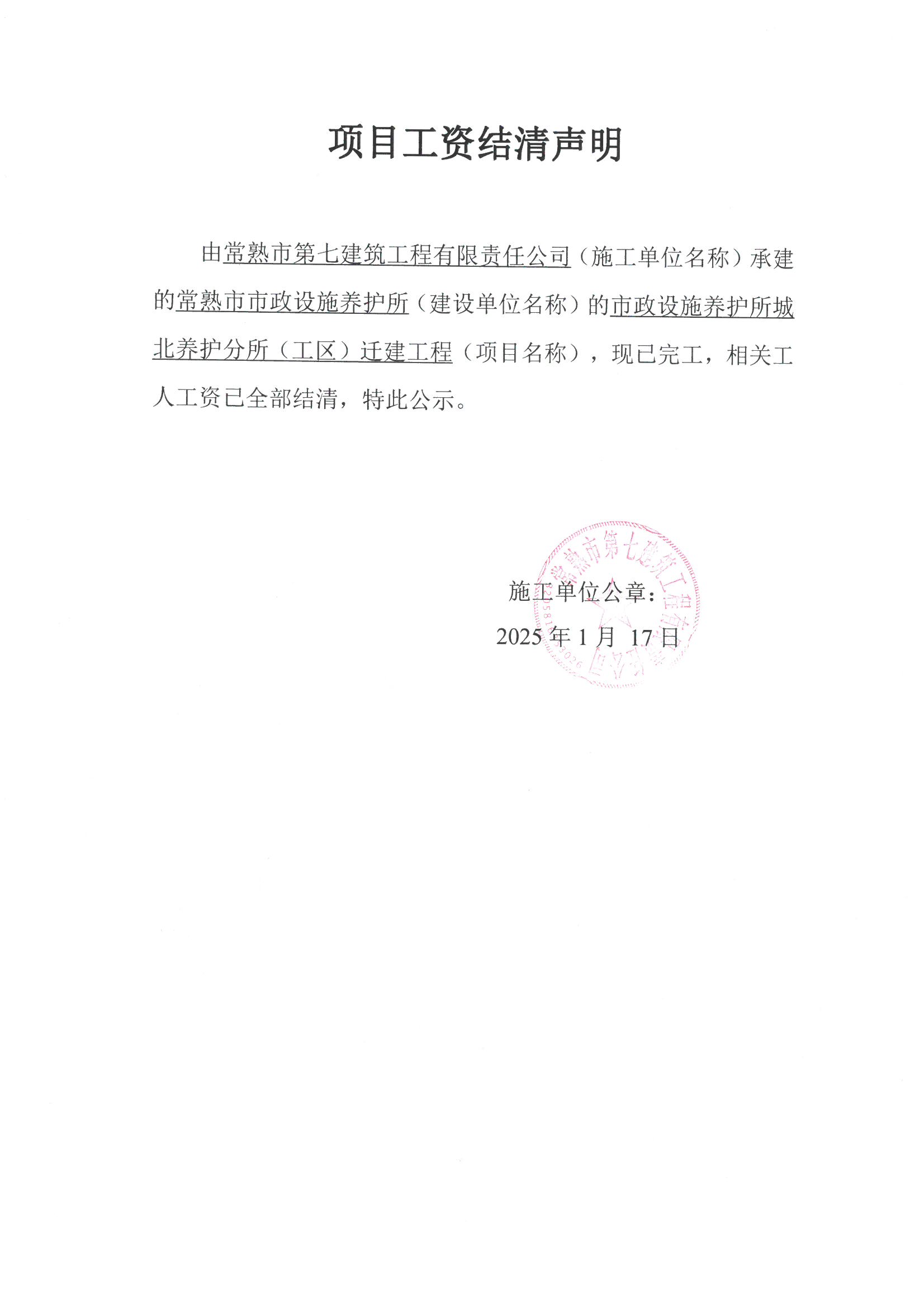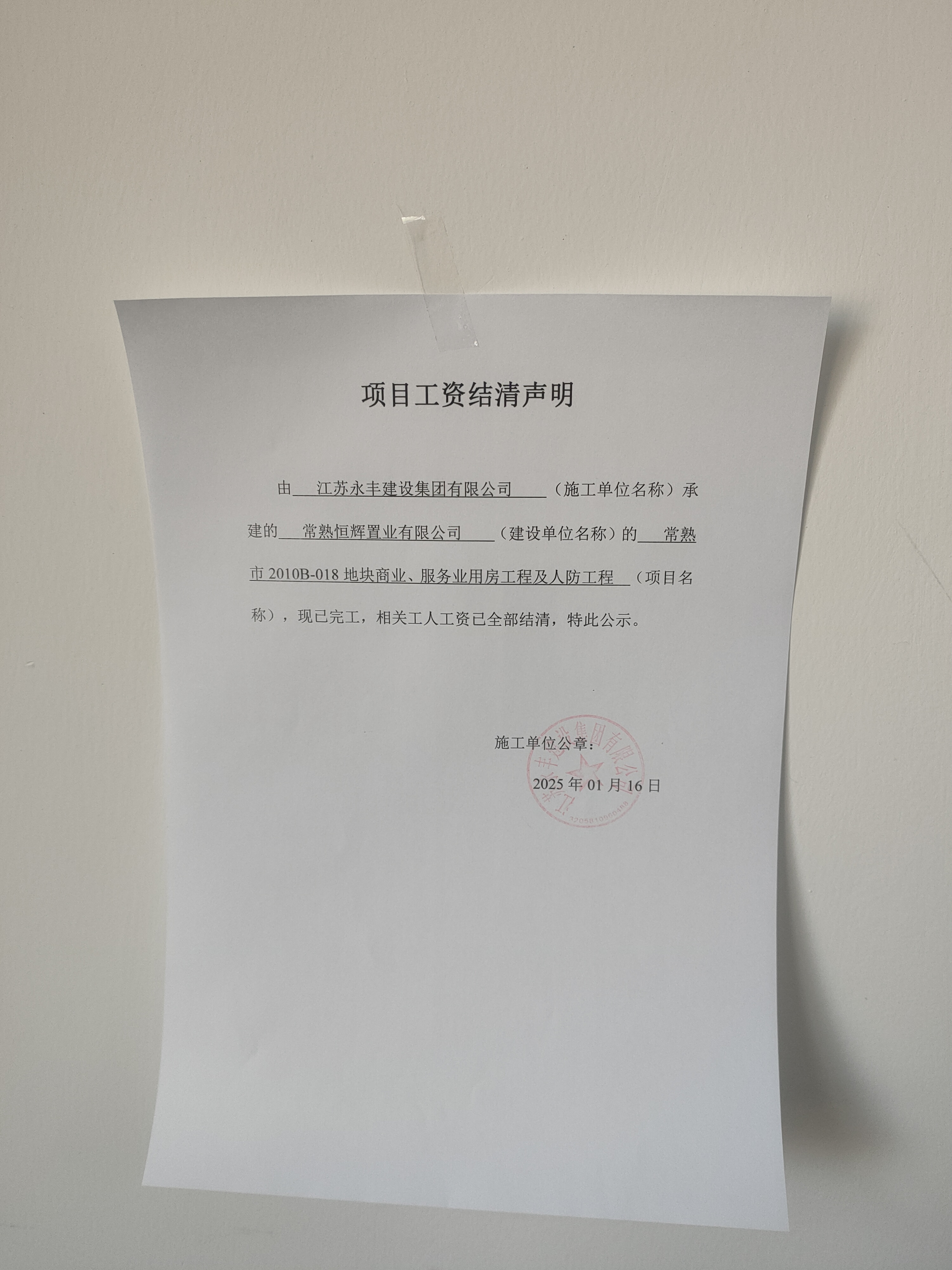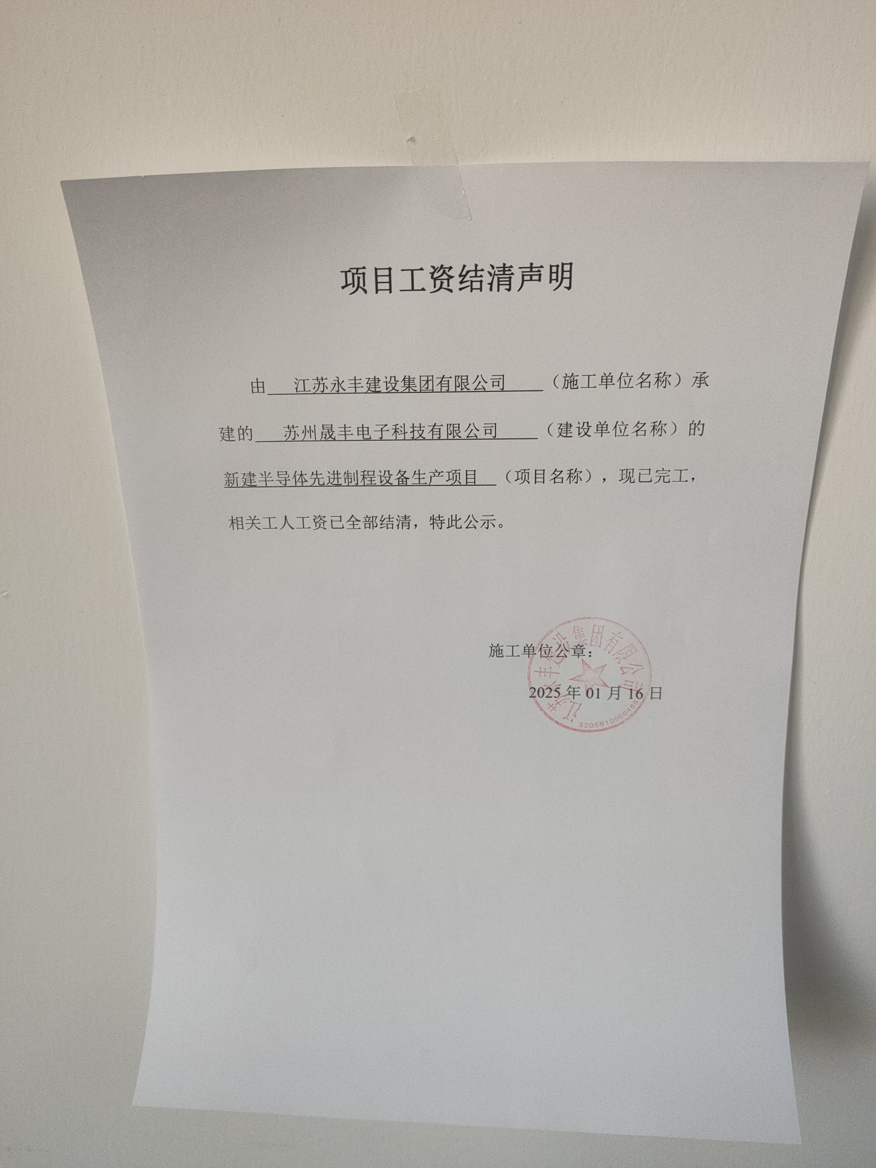 项目工资结清支付公示