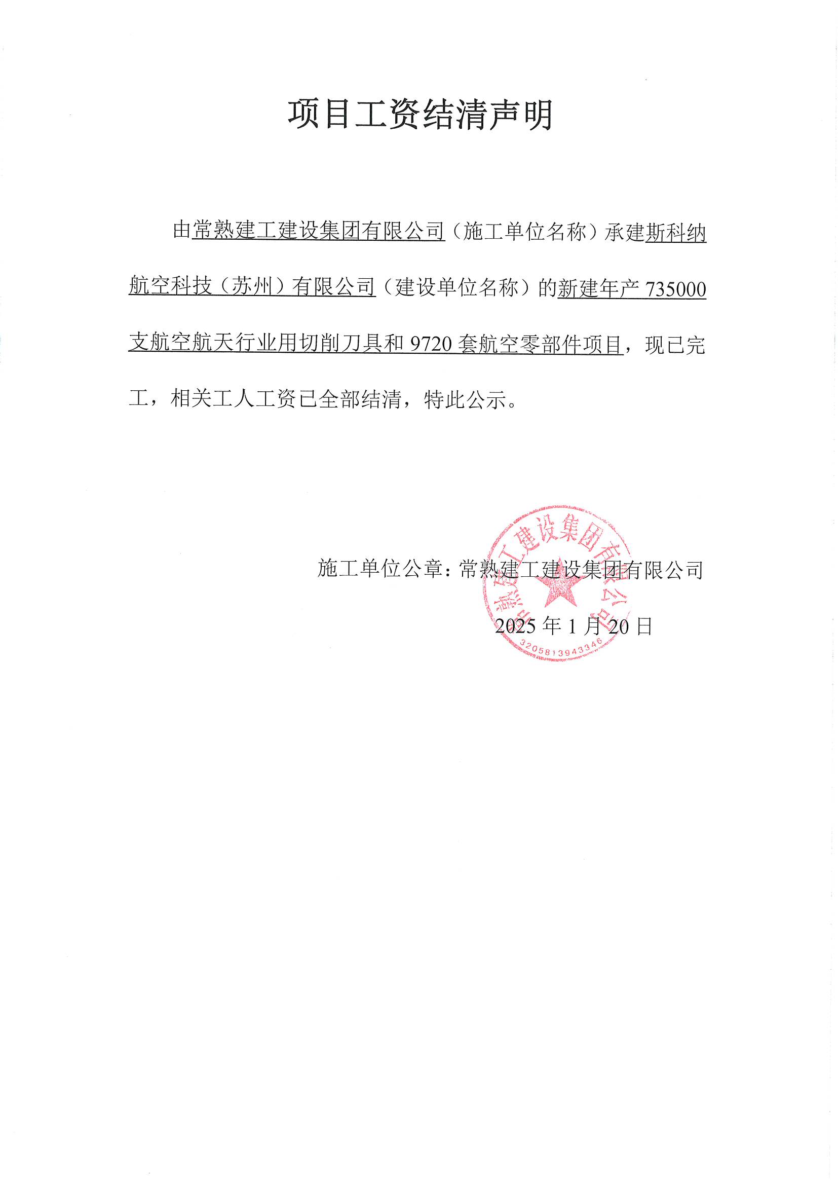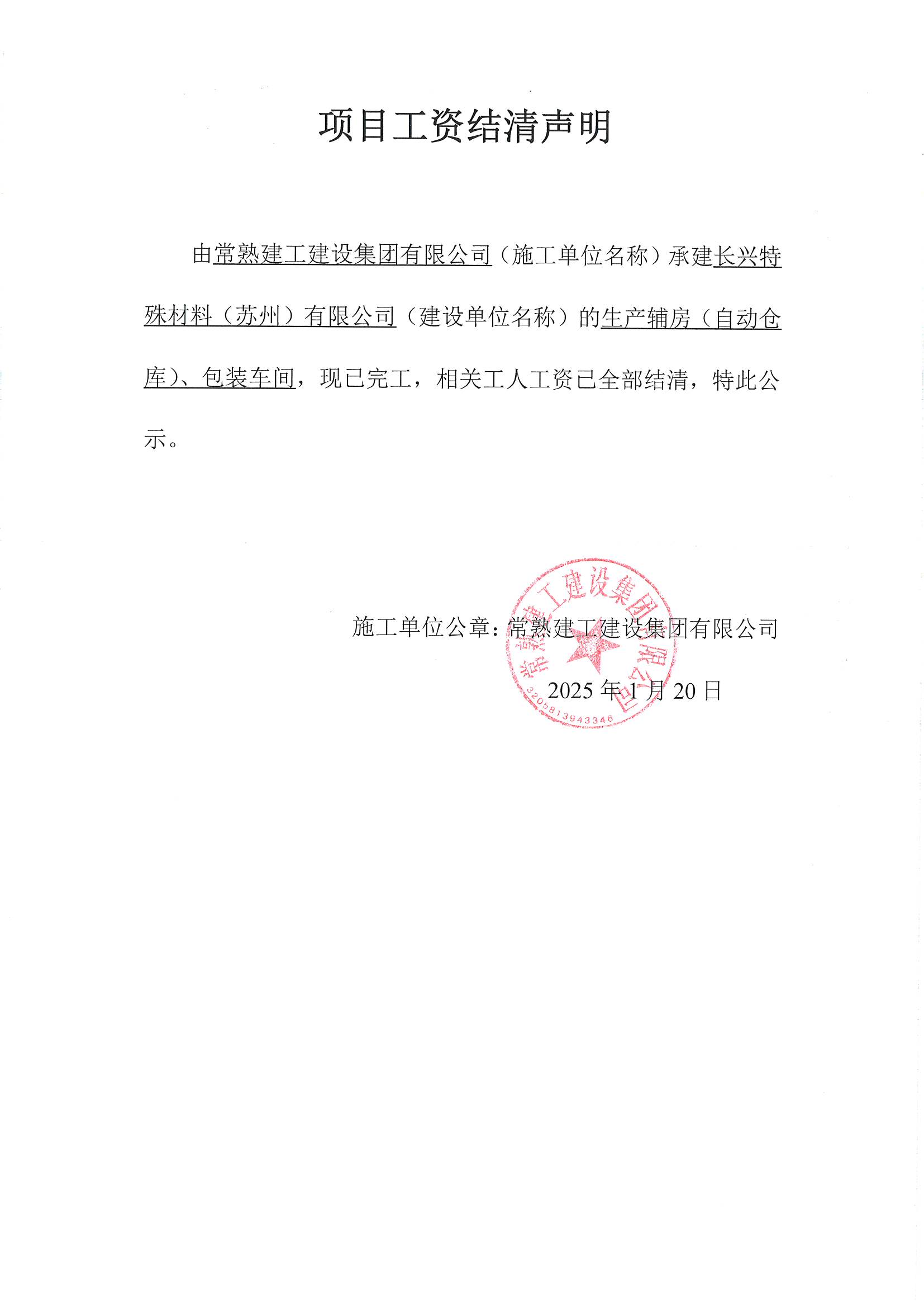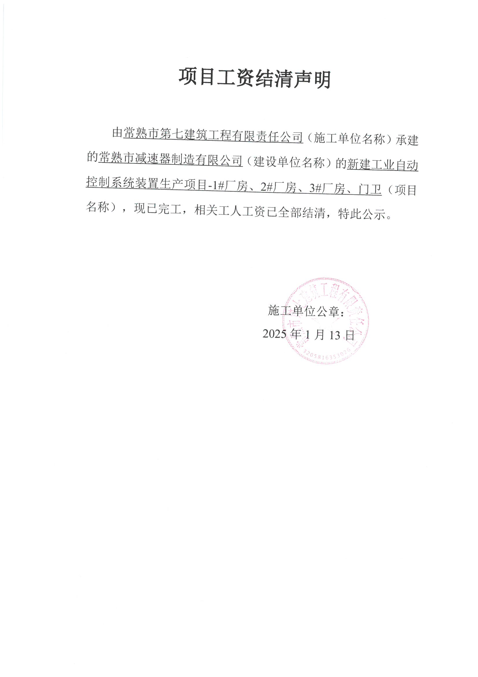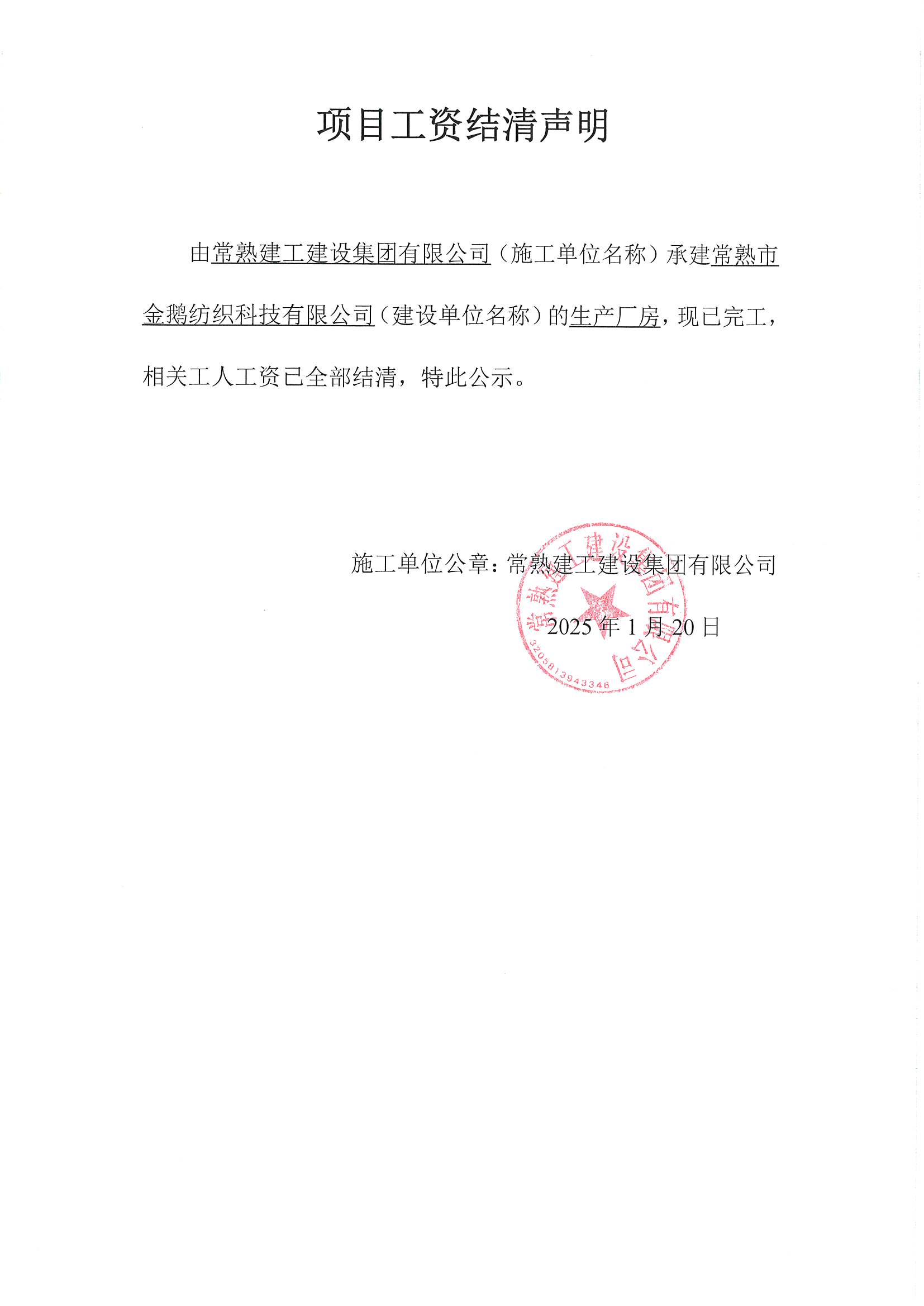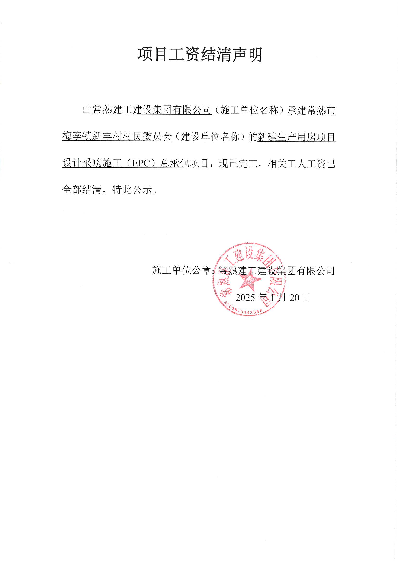 项目工资结清支付公示