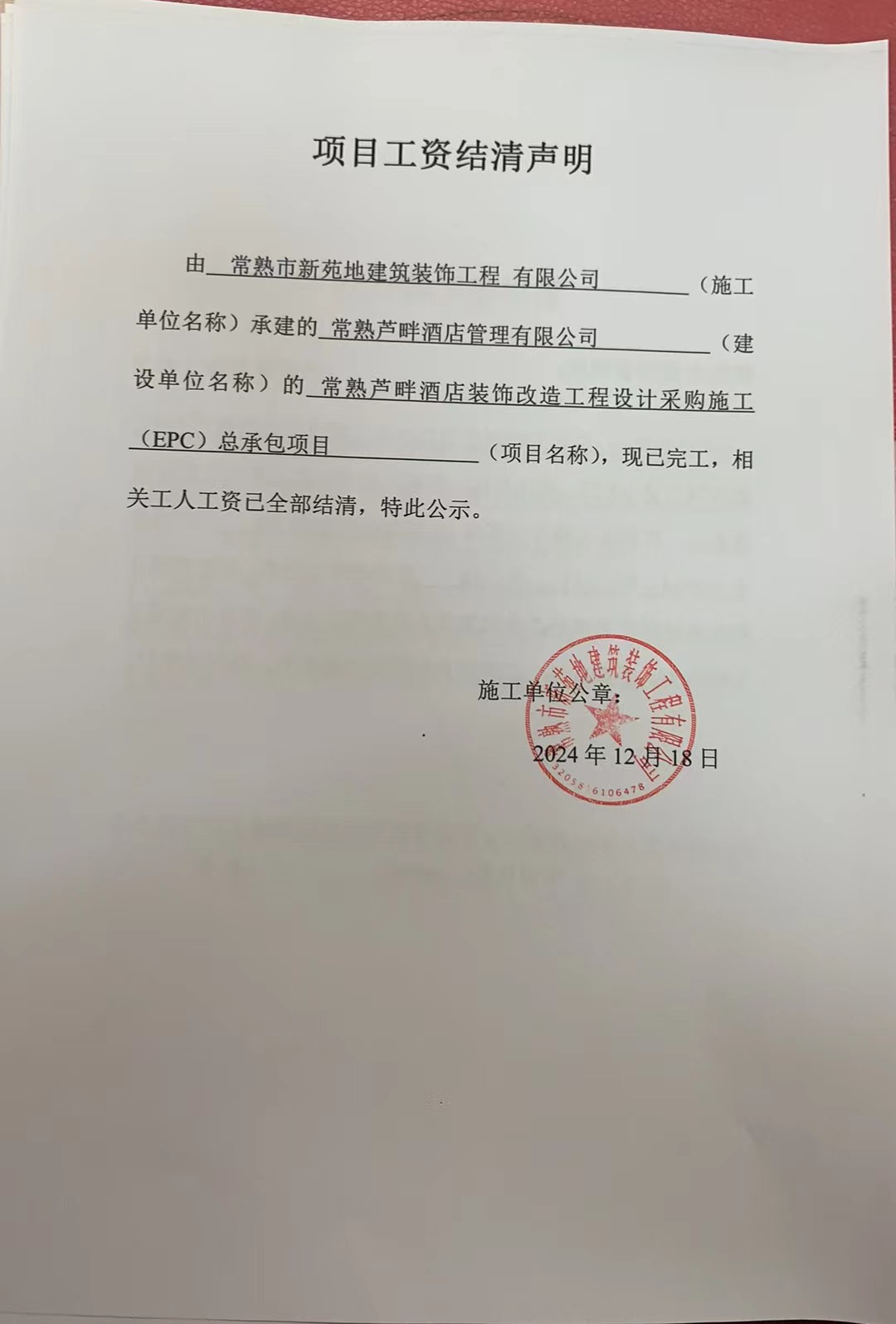 常熟芦畔酒店装饰改造工程设计采购施工(EPC)总承包项目