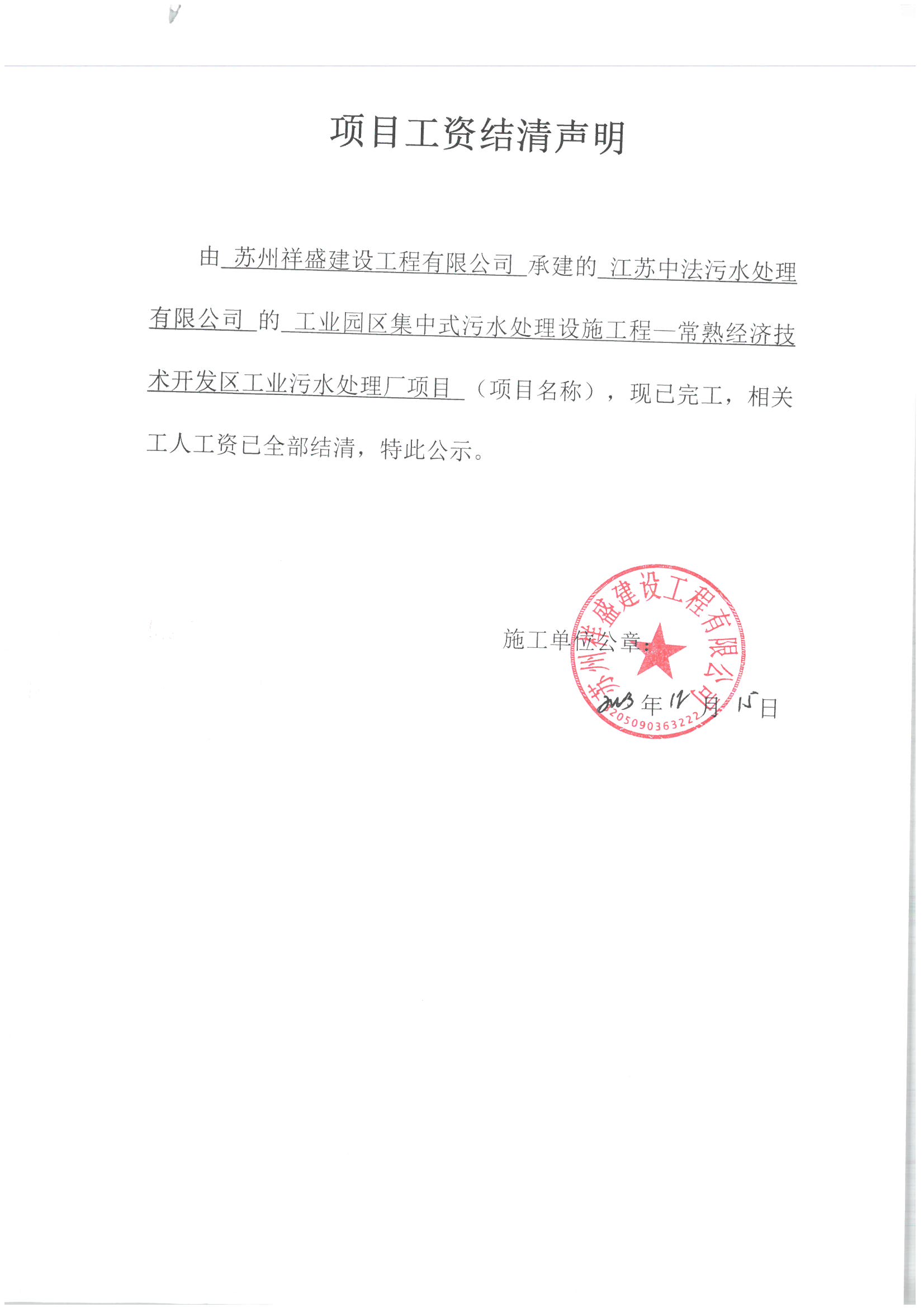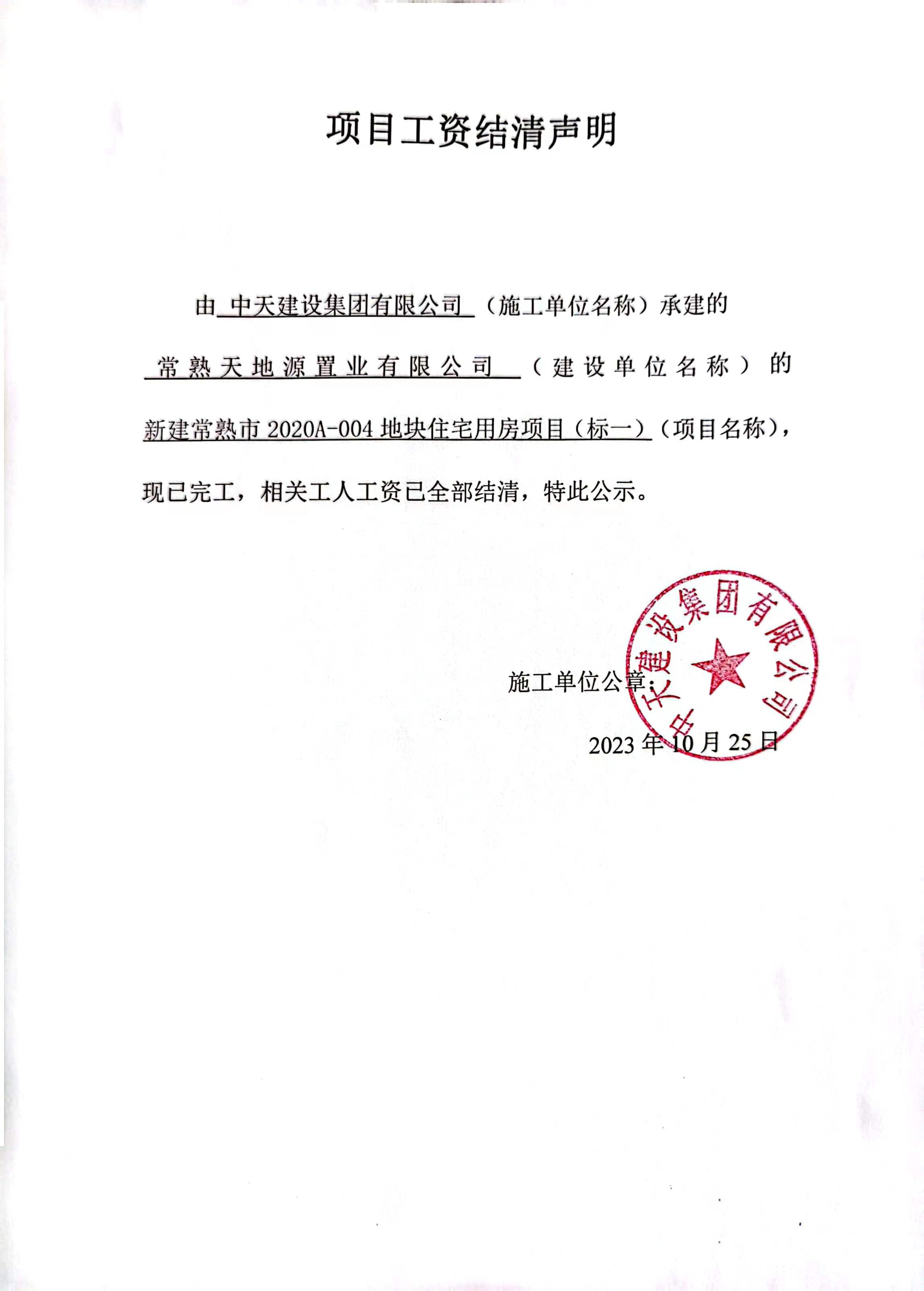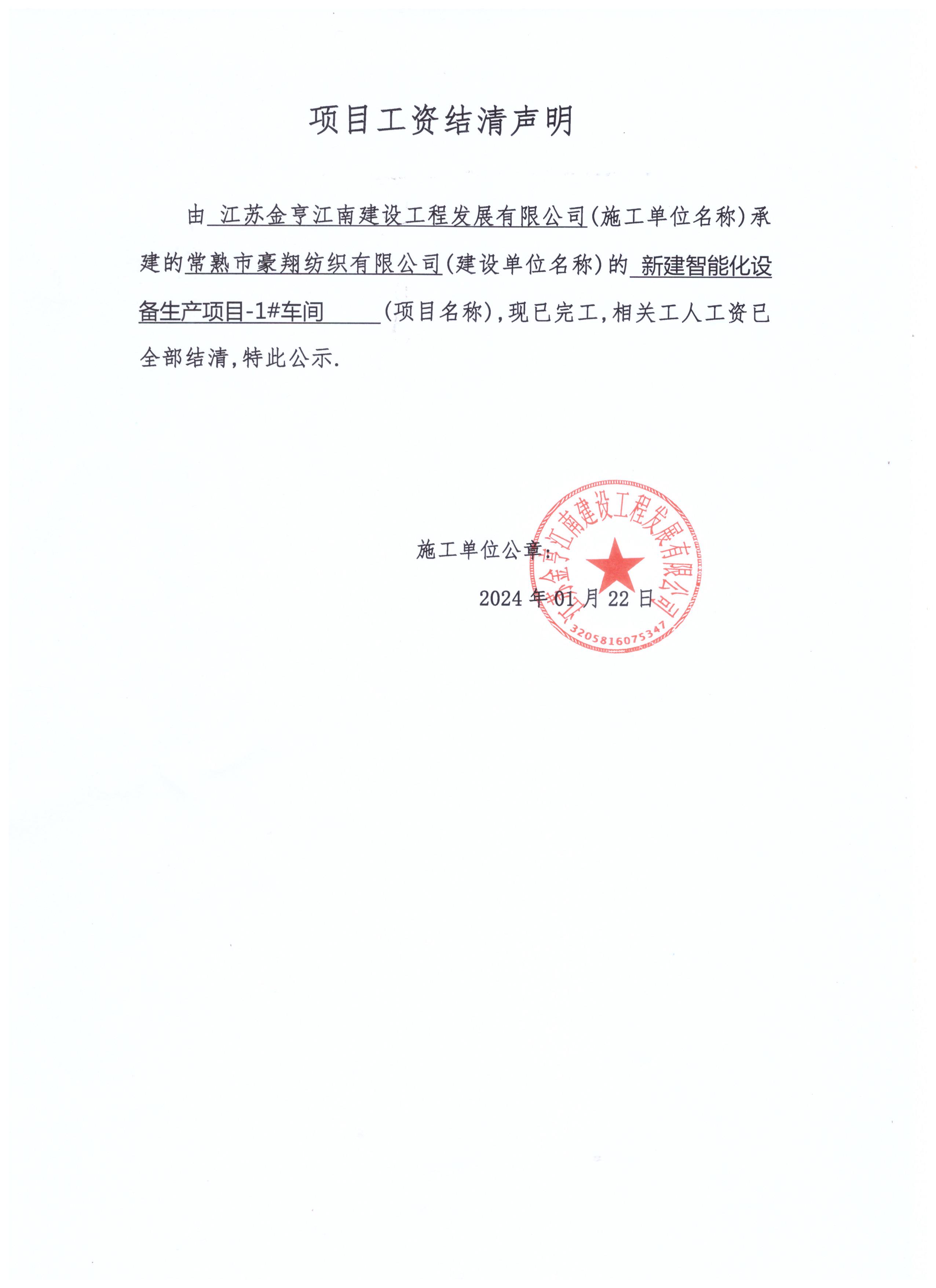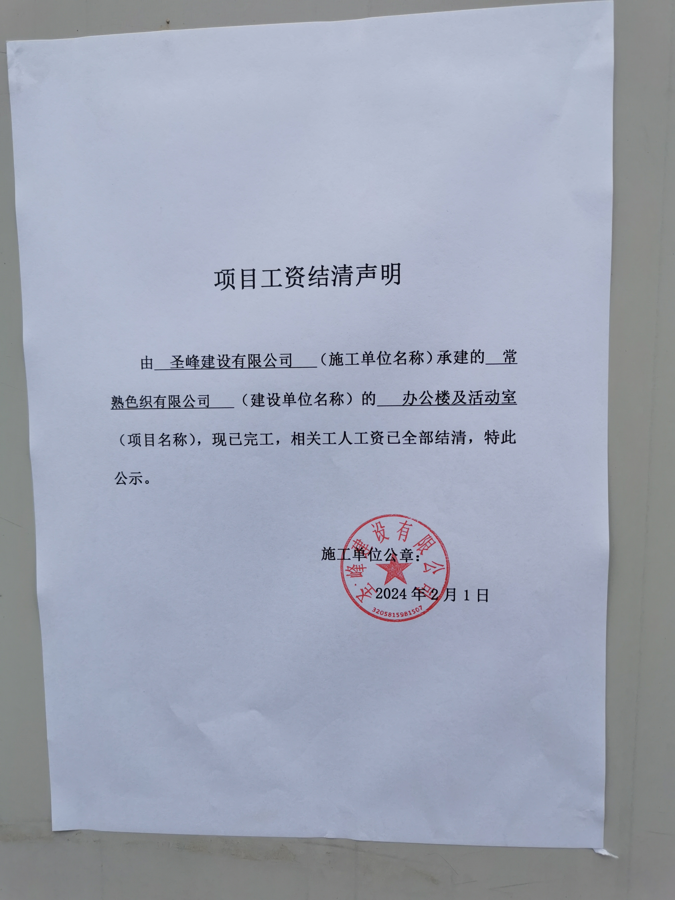 项目工资结清支付公示