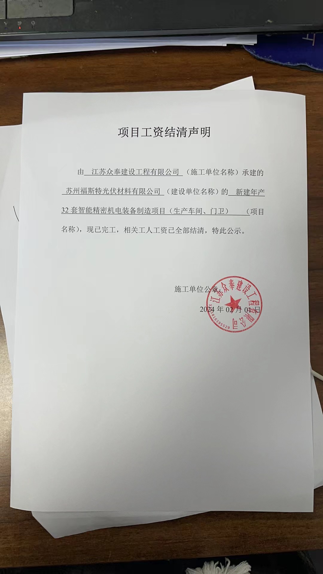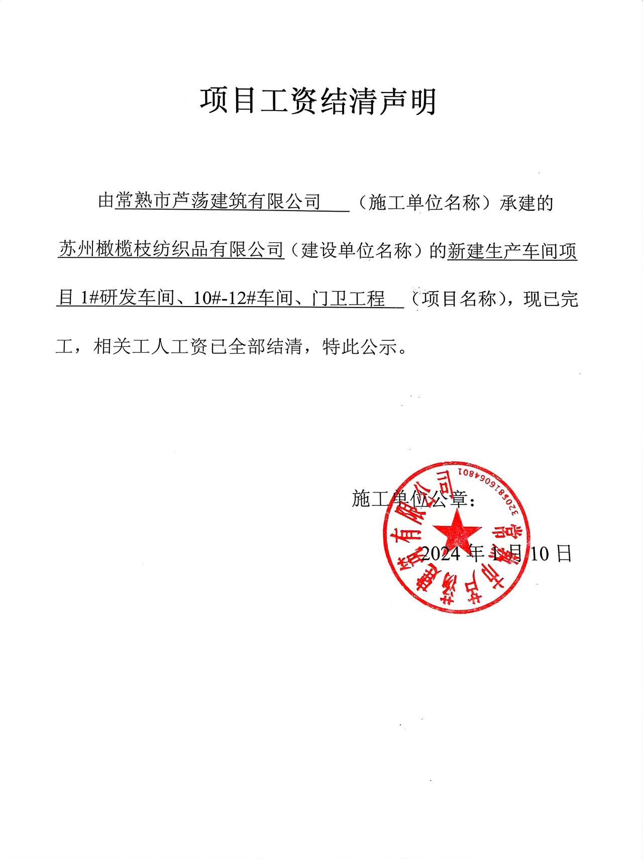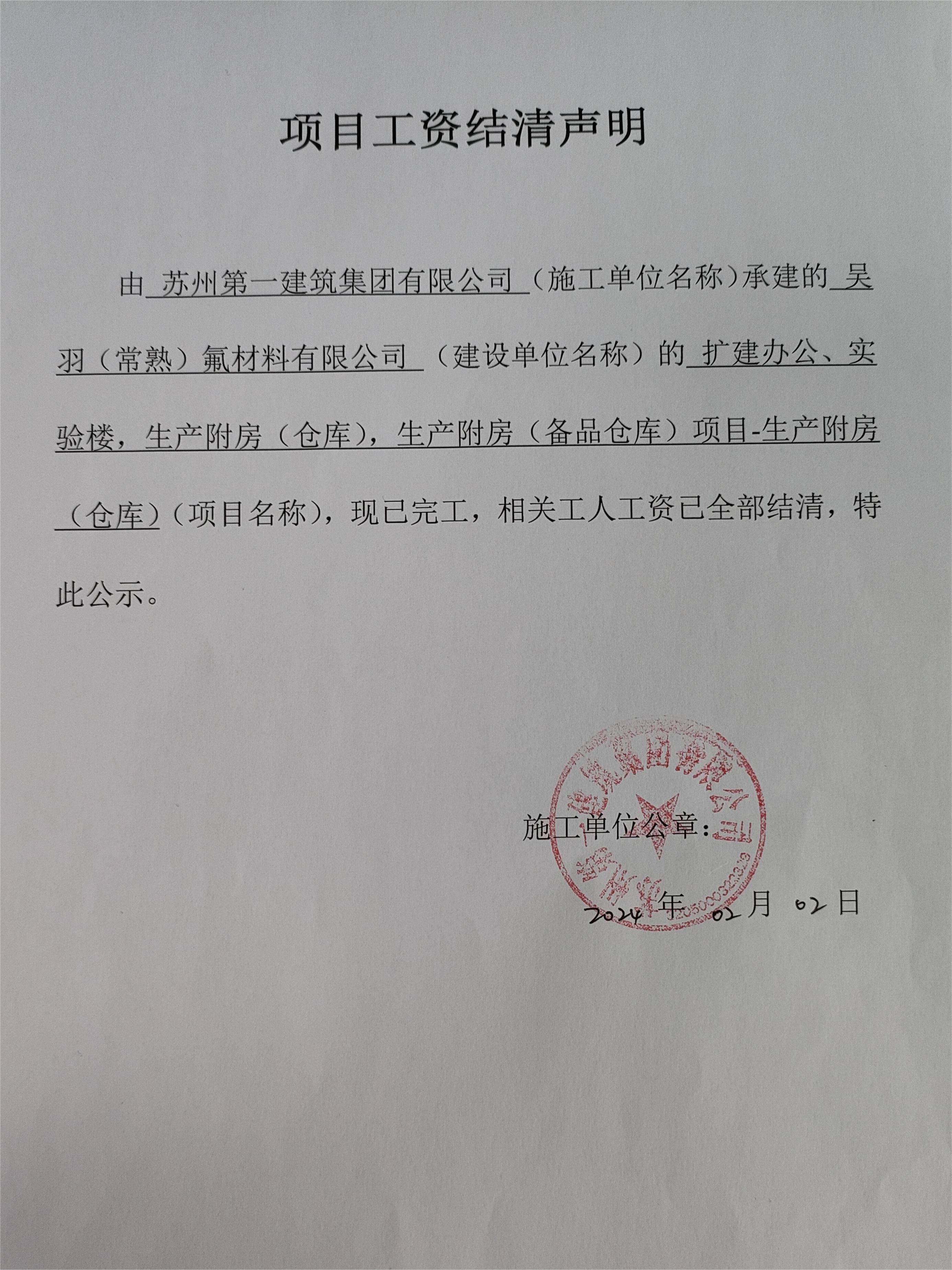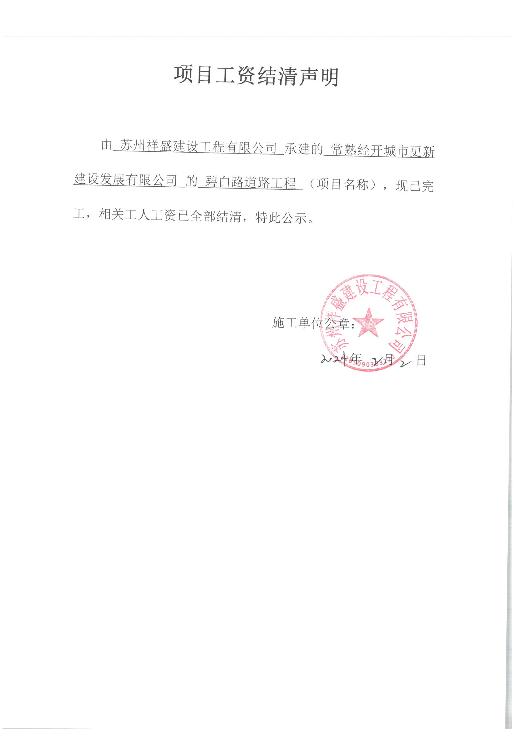 项目工资结清支付公示