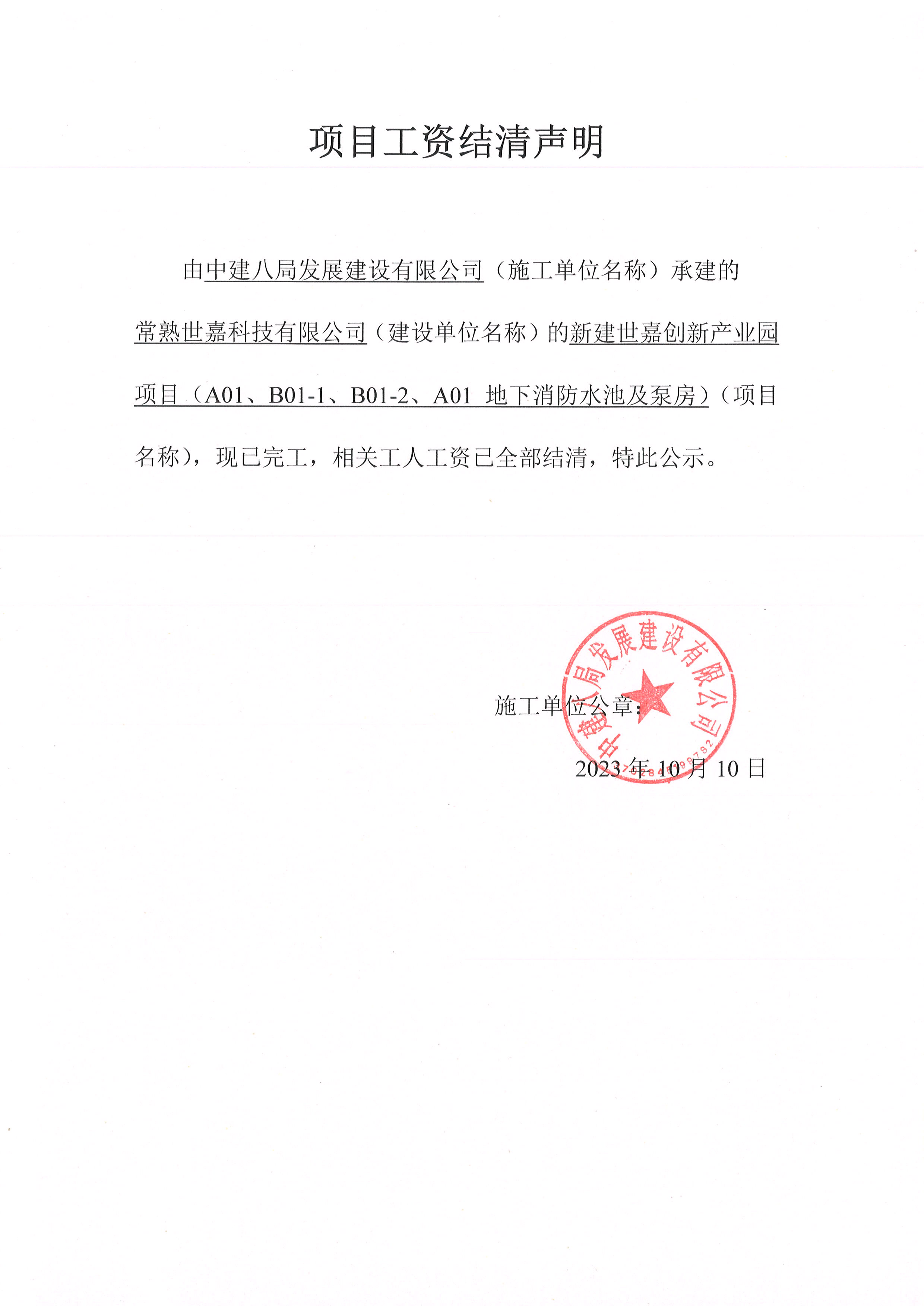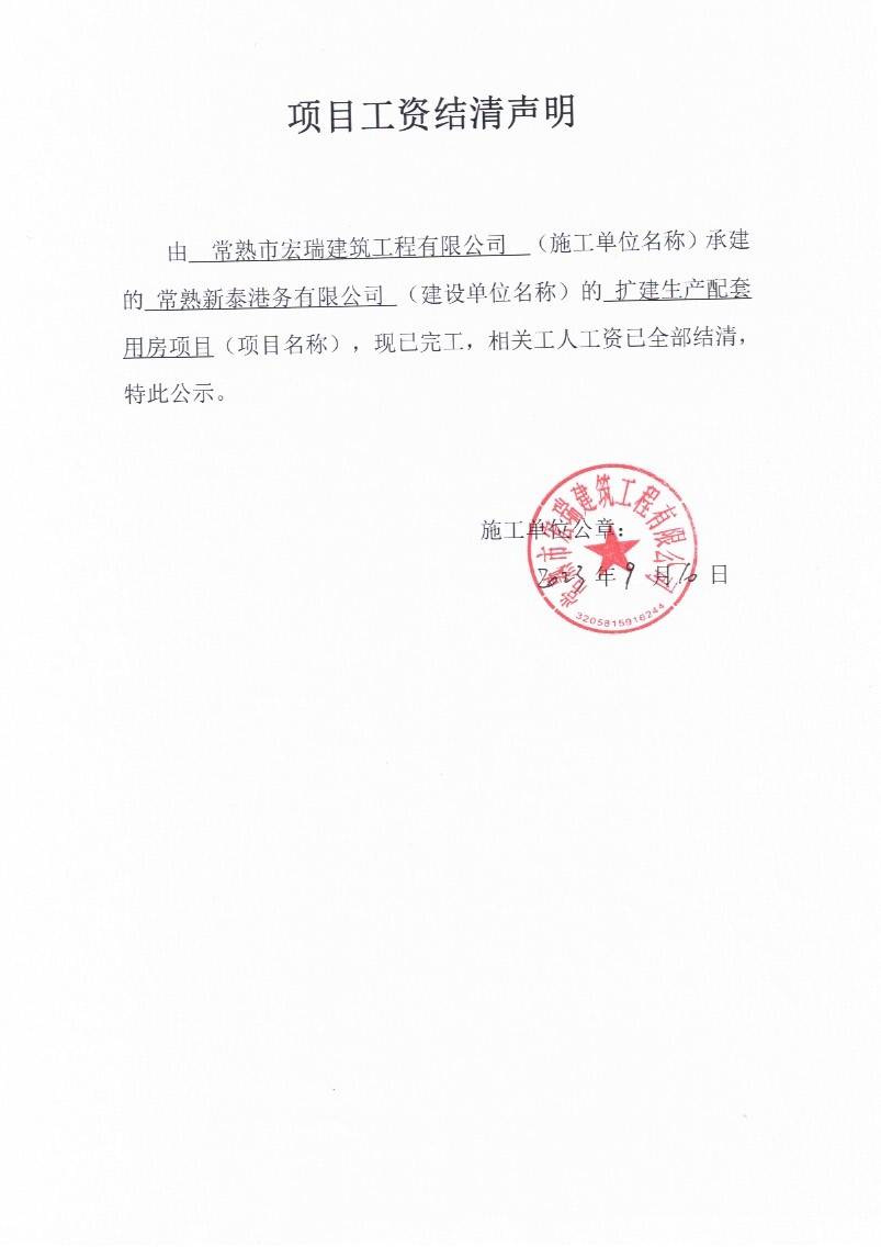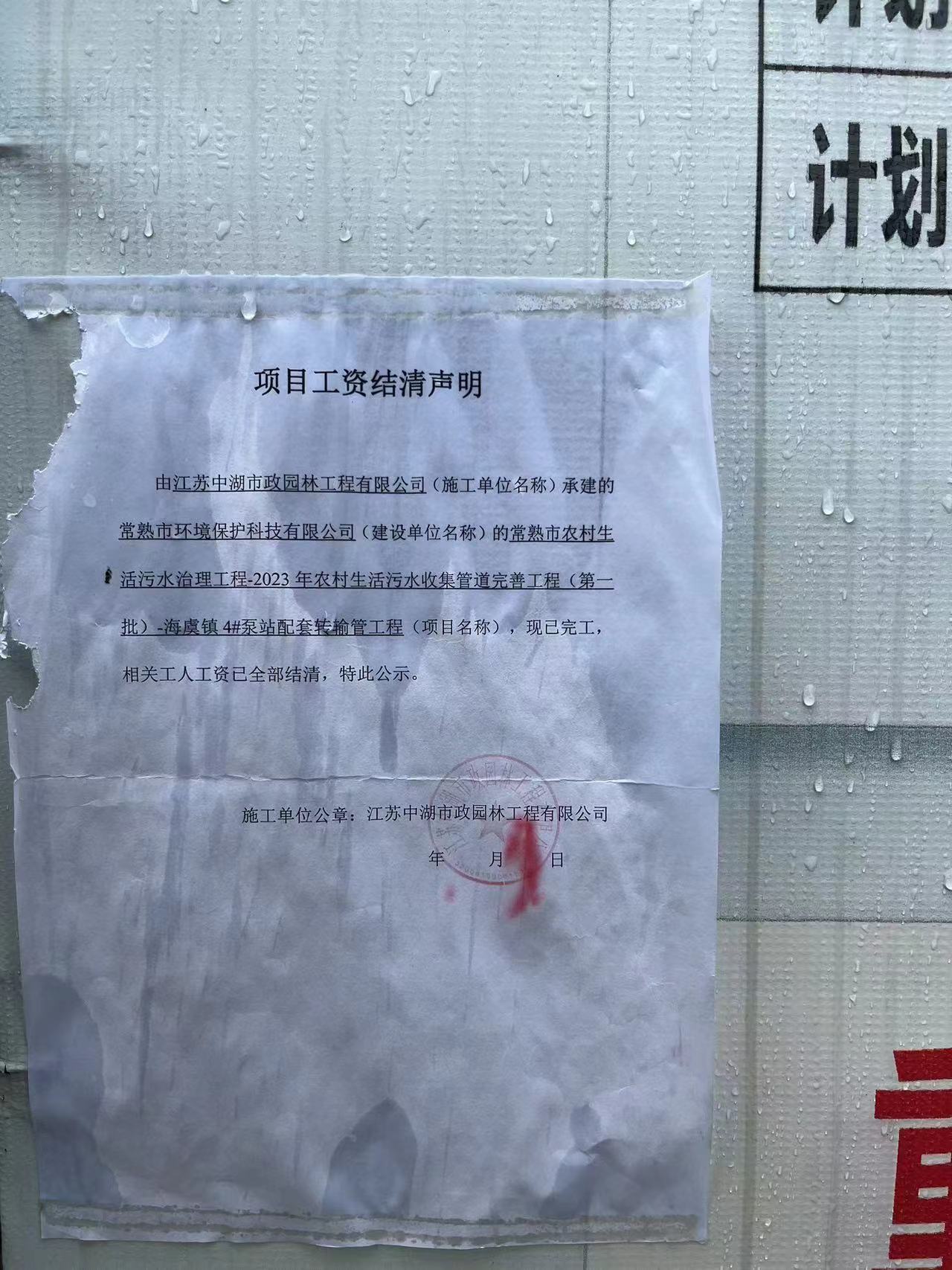 项目工资结清支付公示