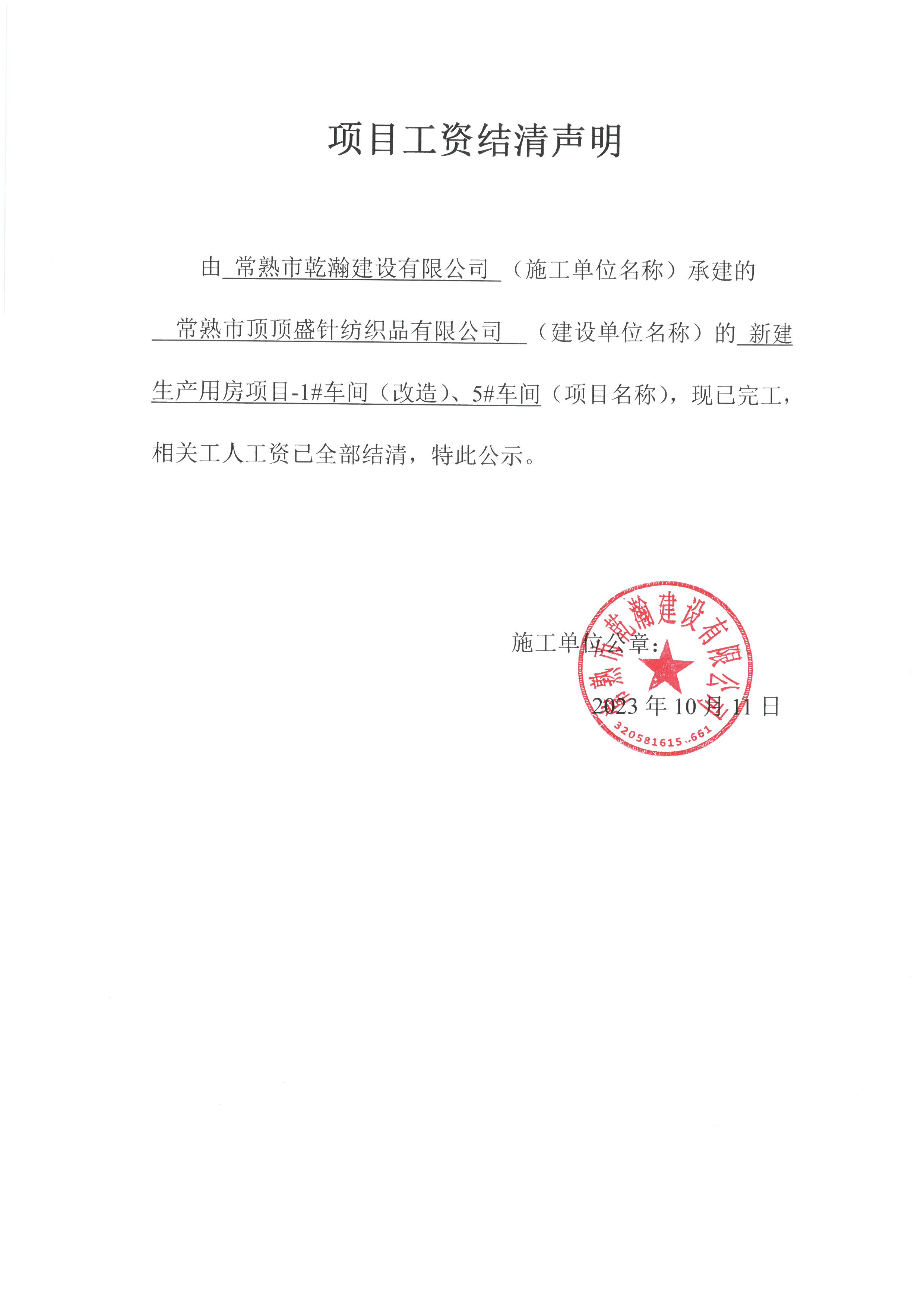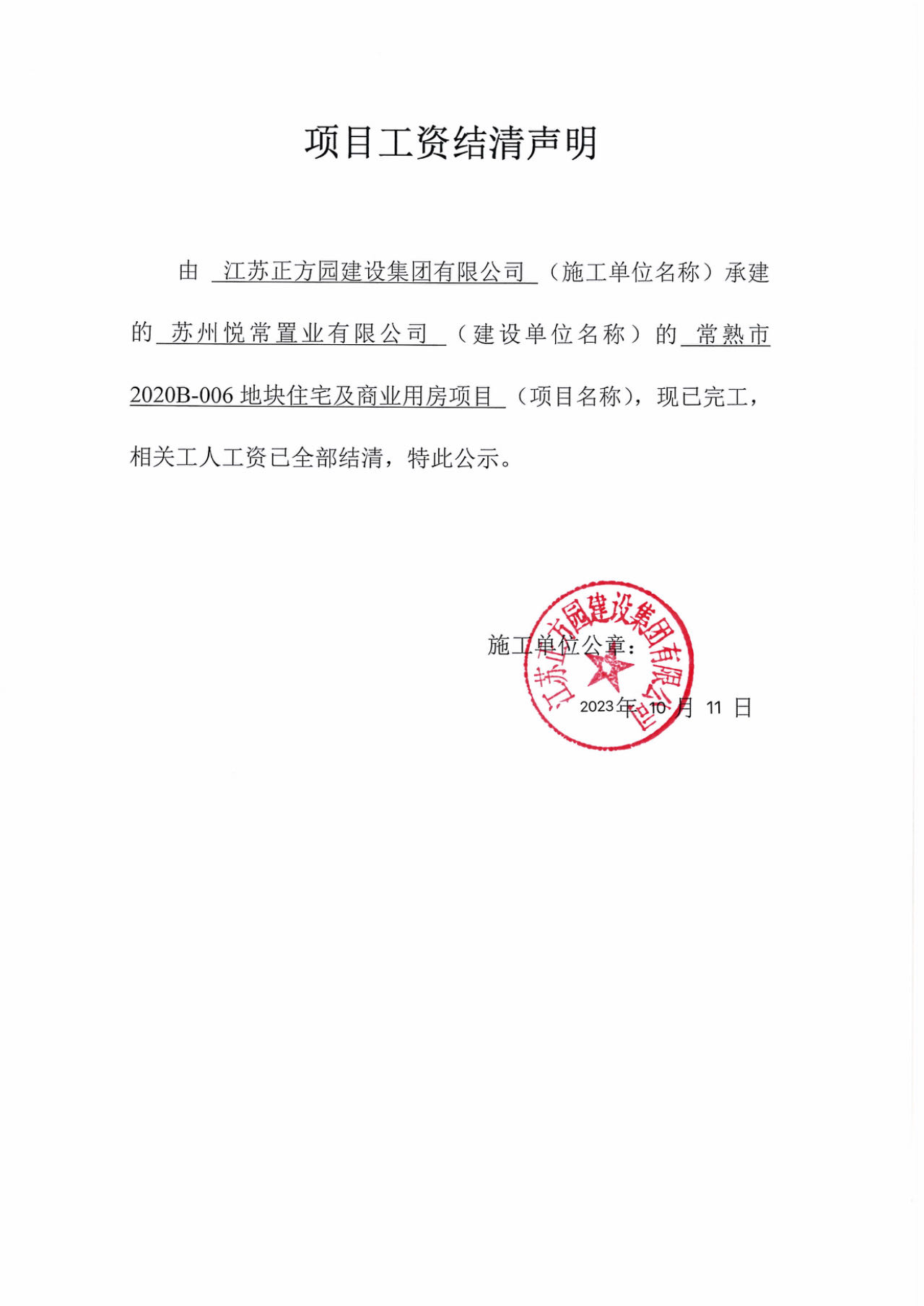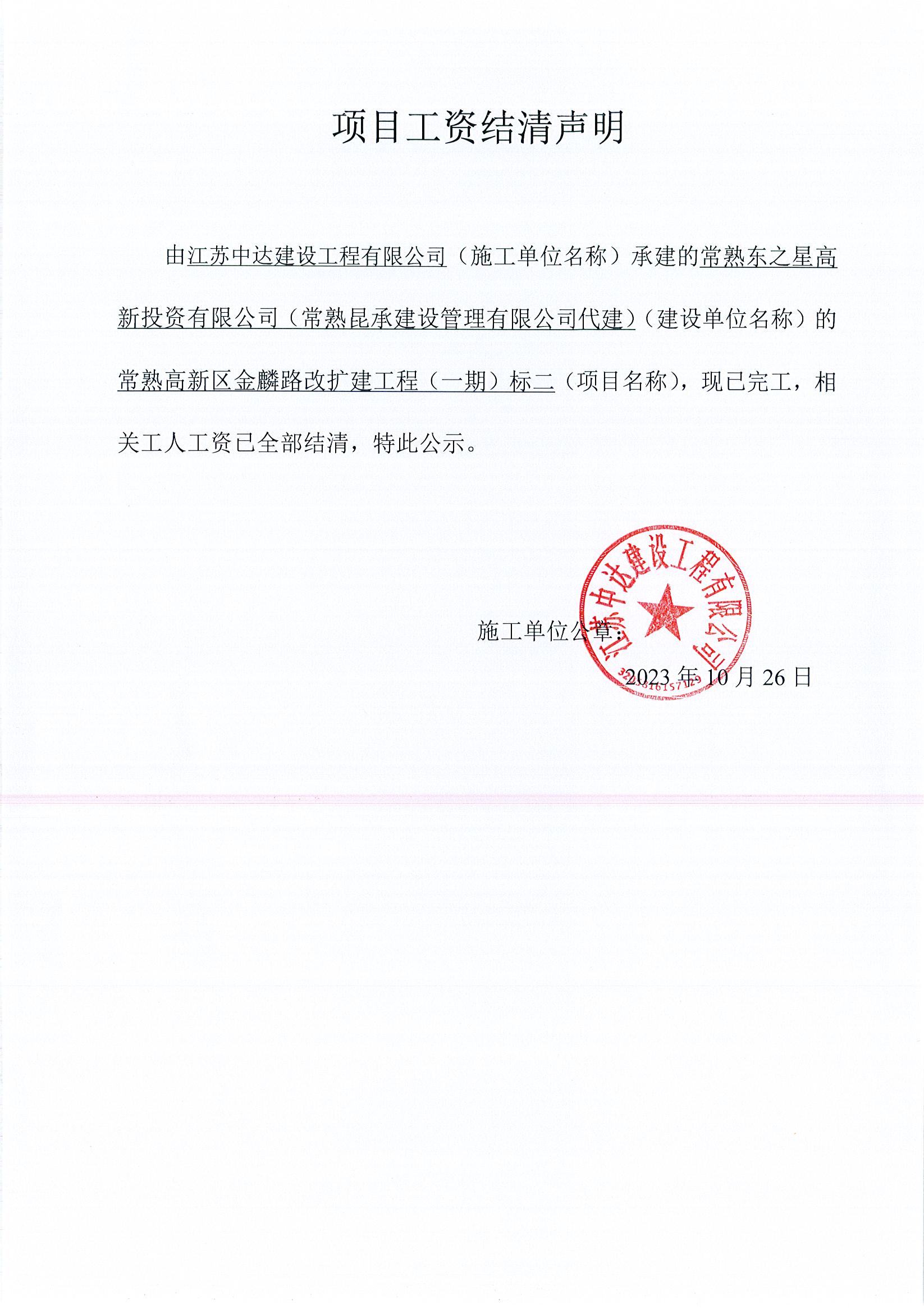项目工资结清支付公示