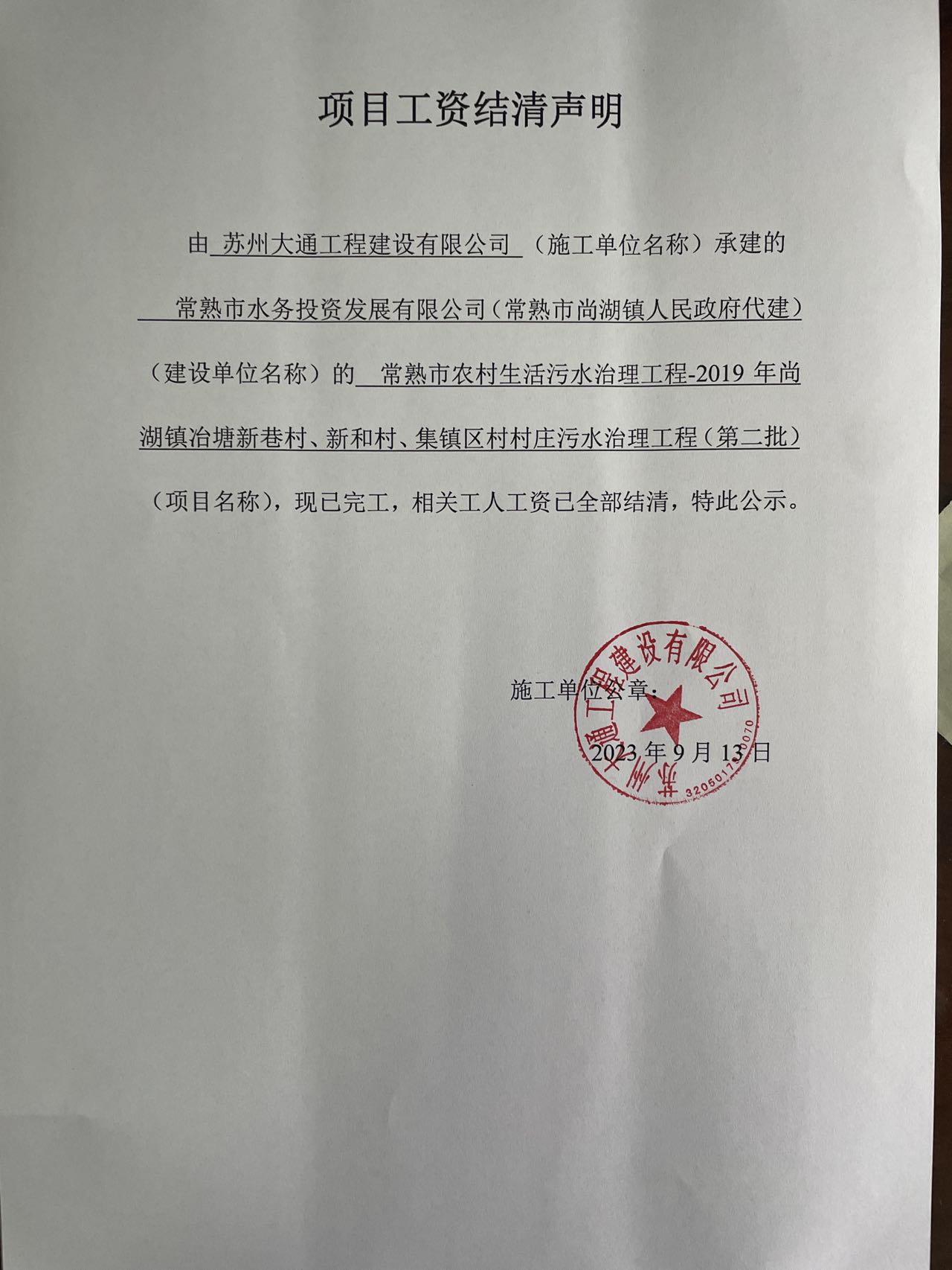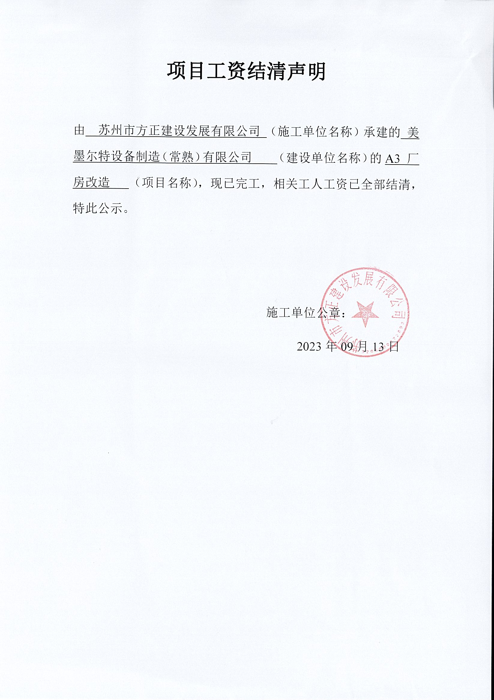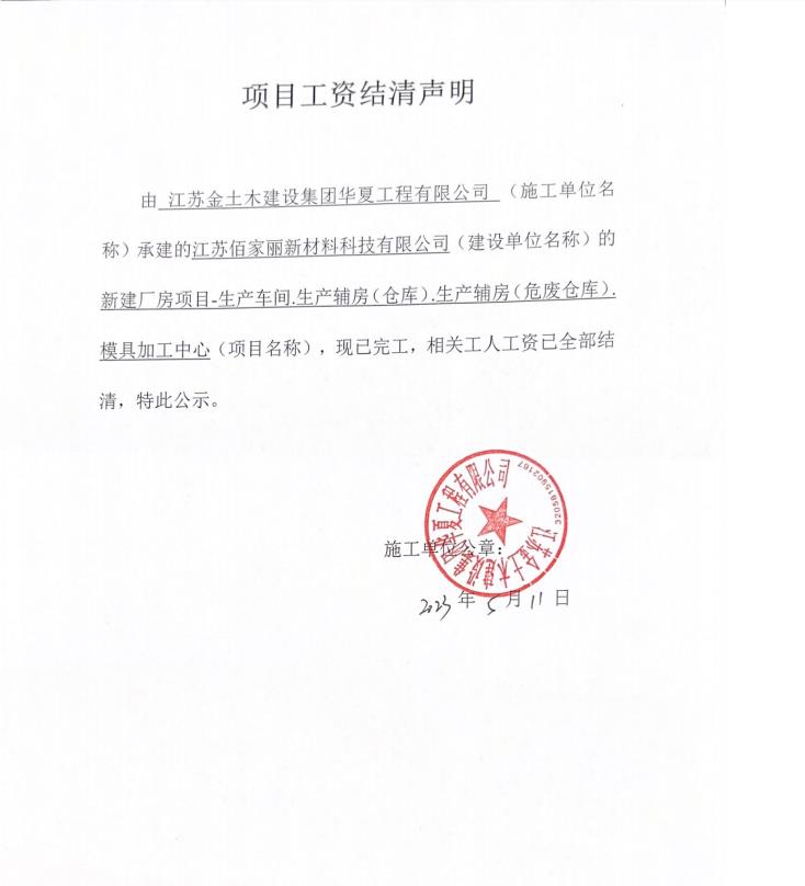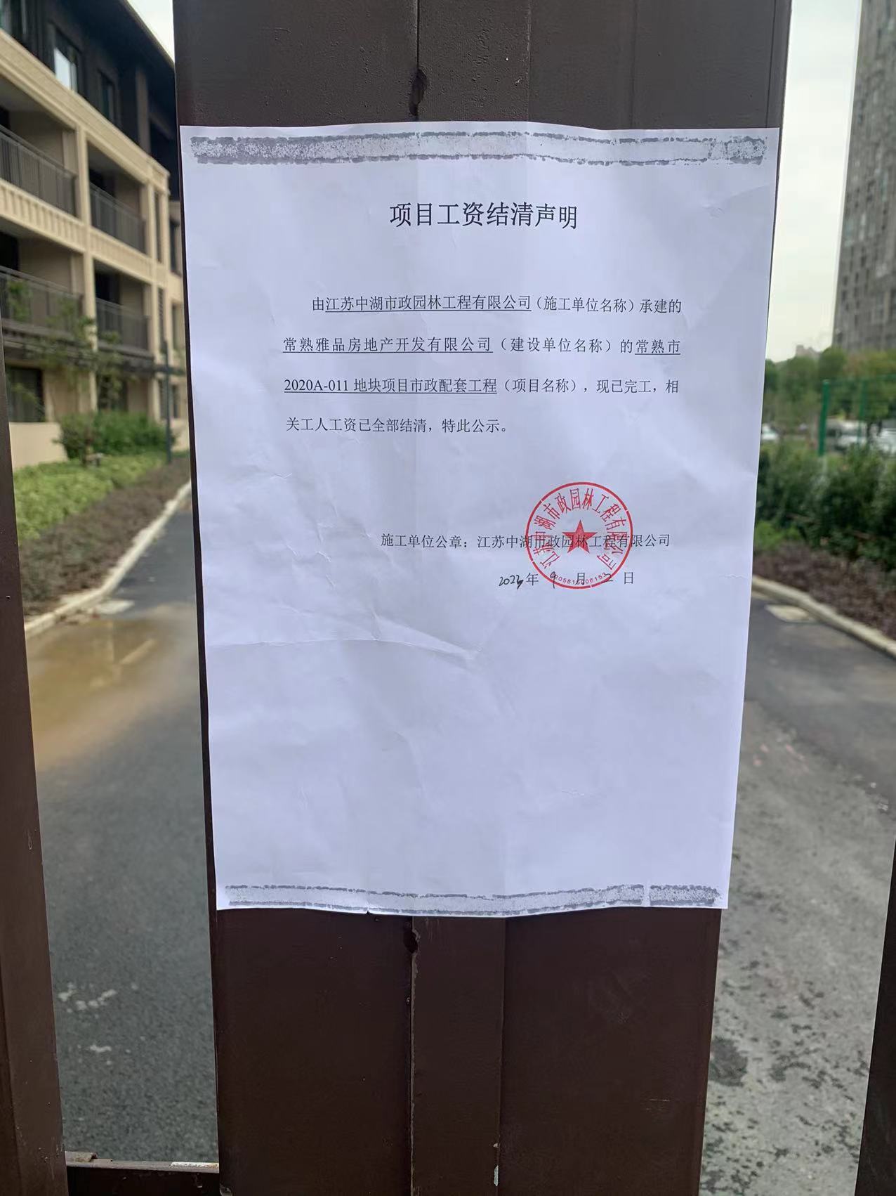 项目工资结清支付公示