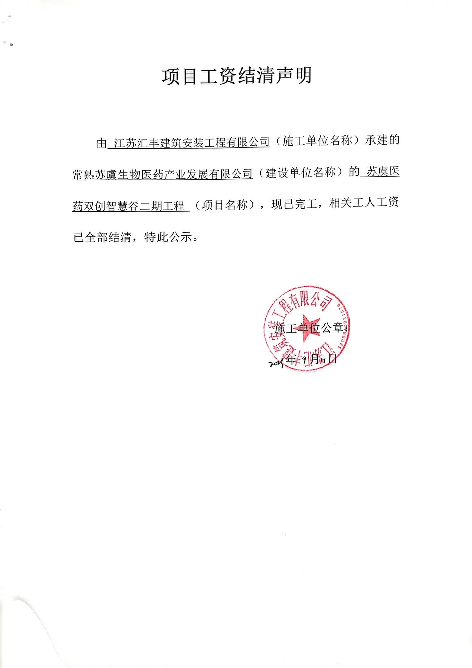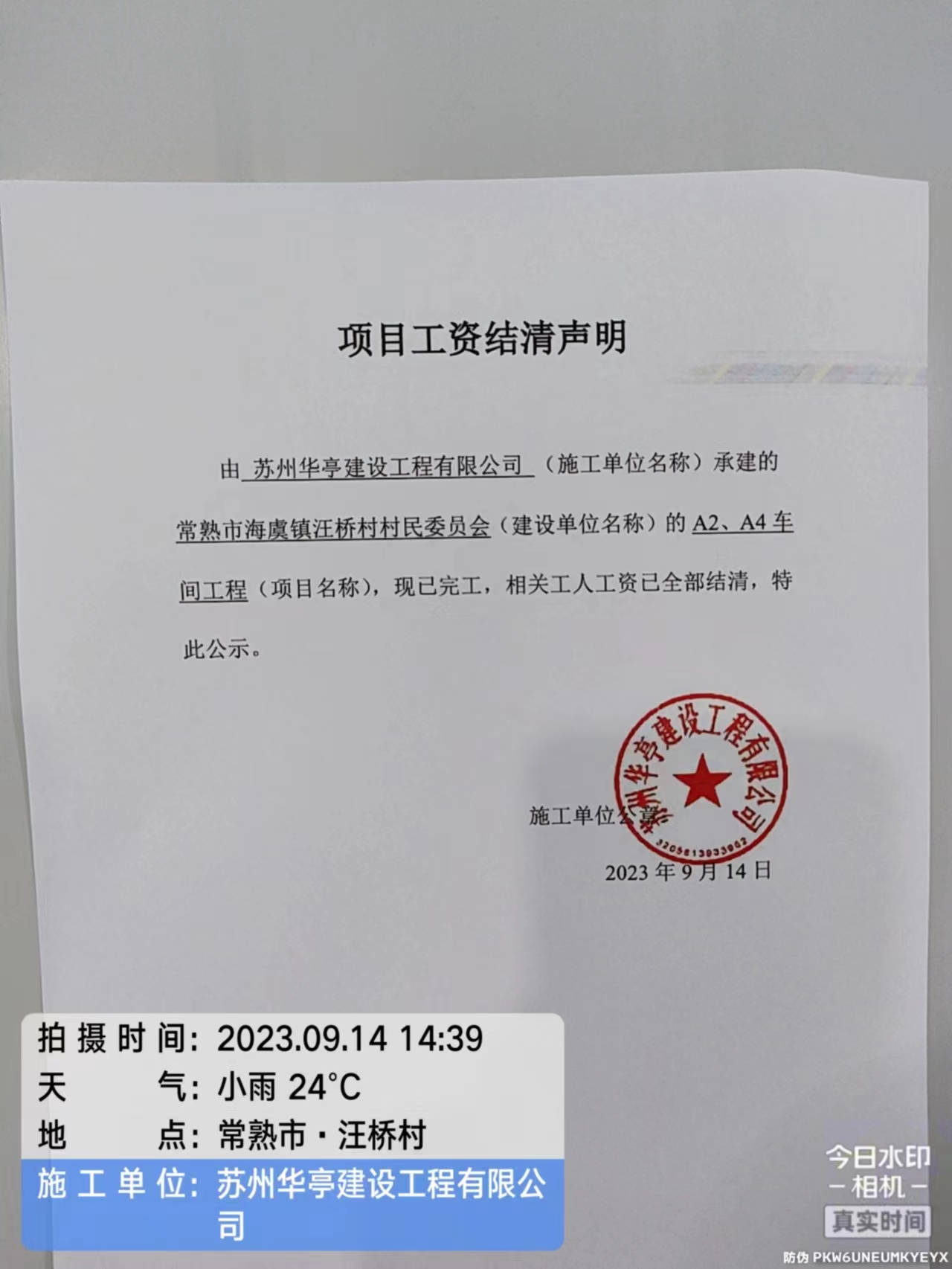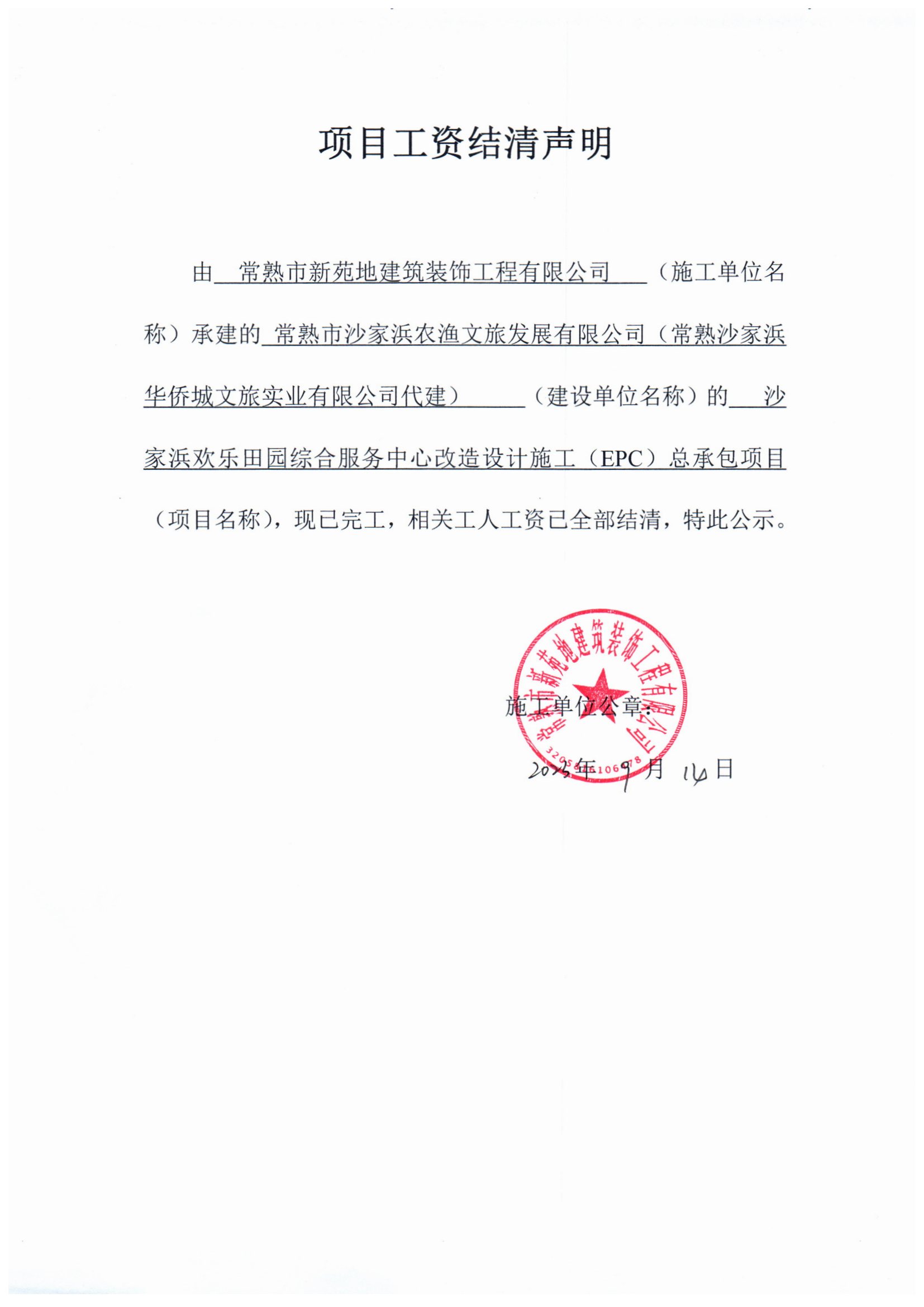 项目工资结清支付公示