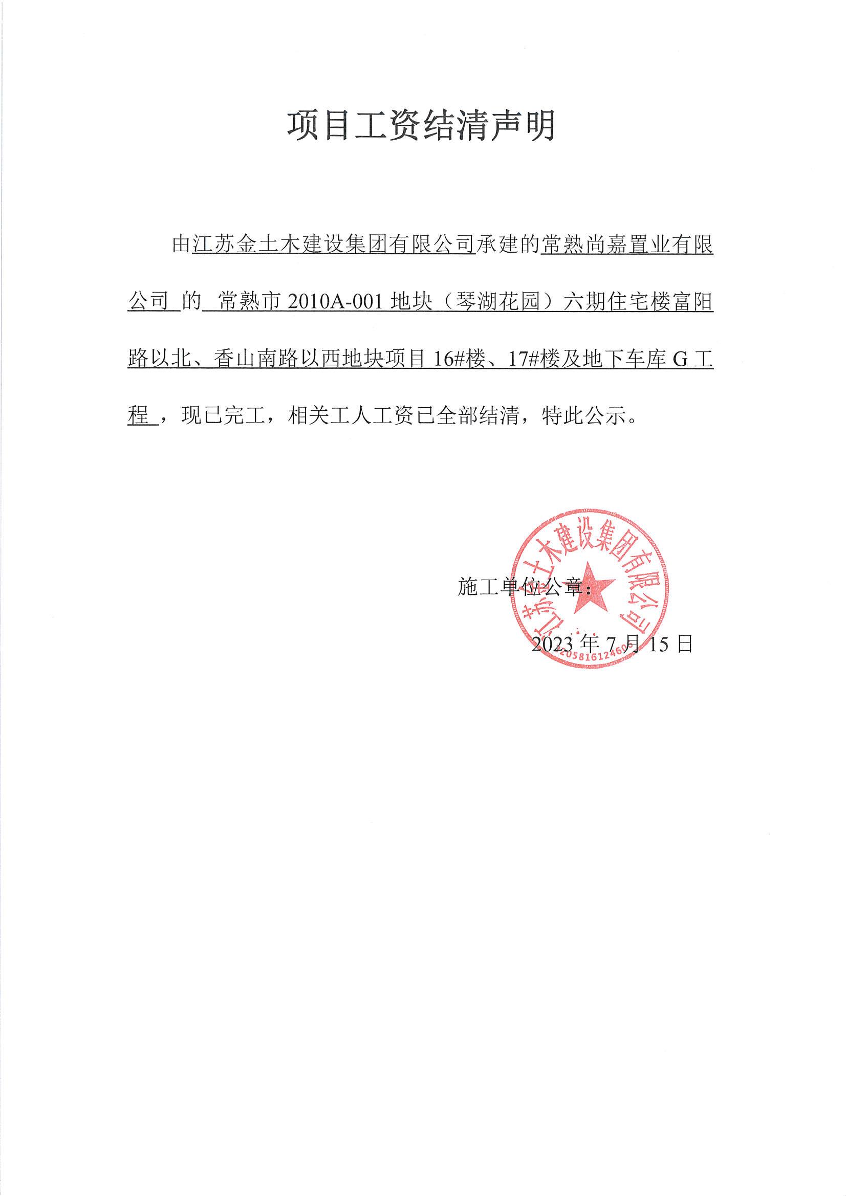 常熟市2010A-001地块(琴湖花园)六期住宅楼富阳路以北、香山南路以西地块项目16#楼、17#楼及地下车库G工程